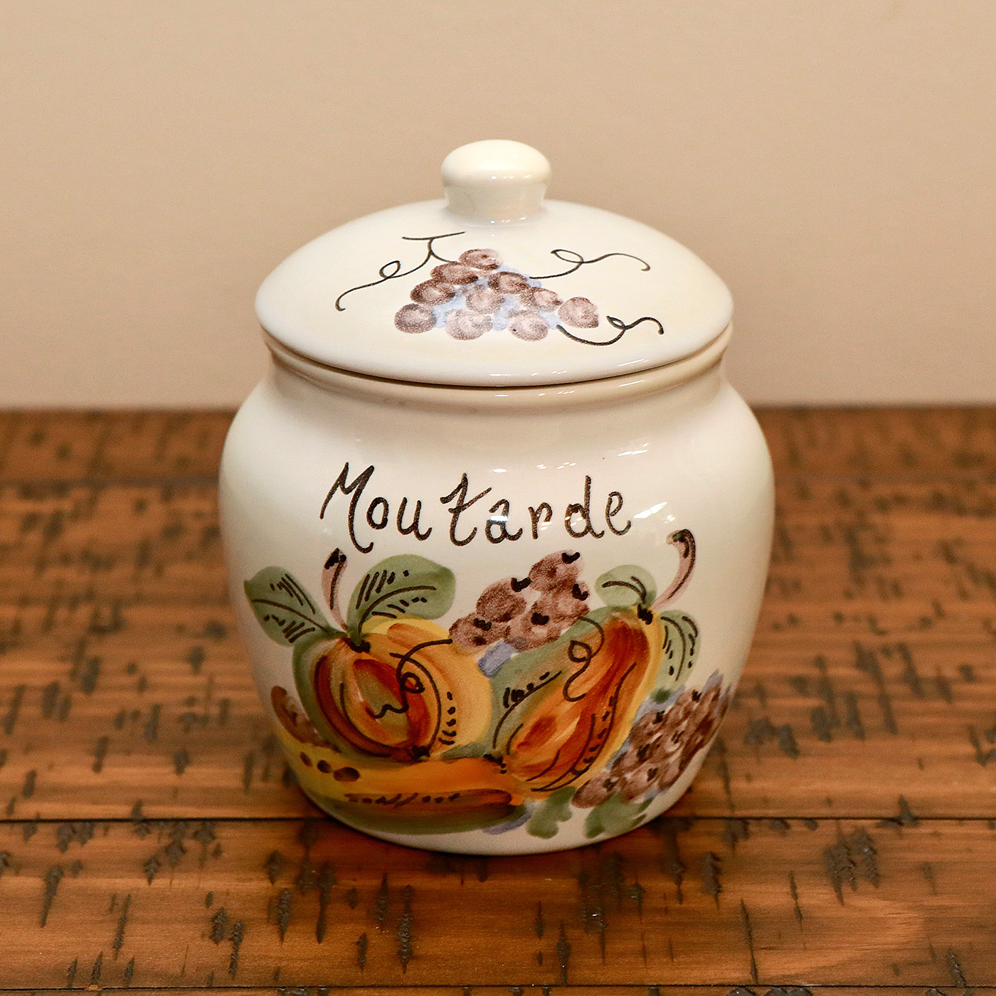 French Mustard Jar With Lid. Hand Painted By Geo Martel. Made in France. 5" Tall and in Very Good Condition.