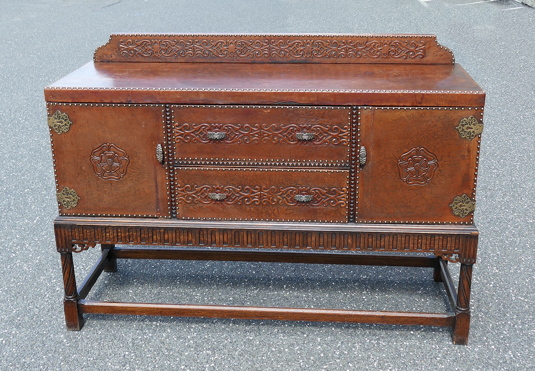 Leather Wrapped Sideboard. Hand tooled leather on a carved wood base. Two drawers and two shelves behind two doors. In Good condition with some wear and marks.