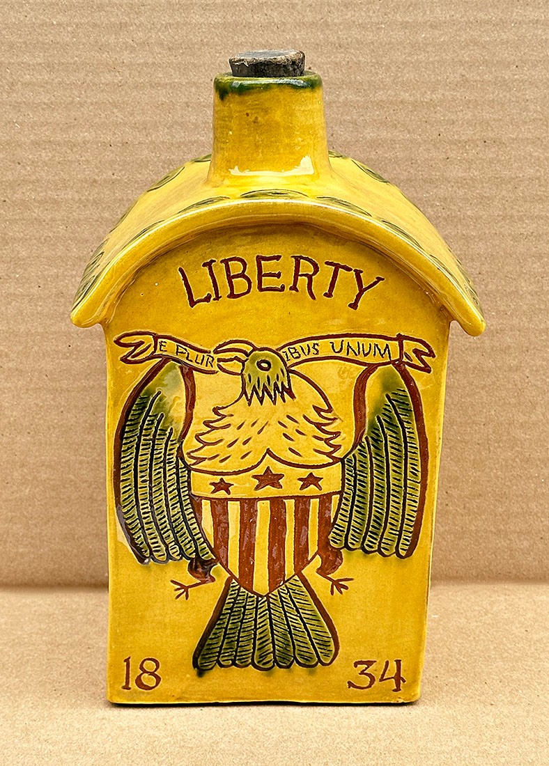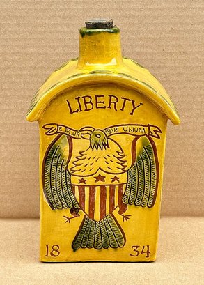 House Shaped Pottery Whiskey Jug - Liberty. Signed on the base by the maker - R. Shaeff. In Very Good/Excellent Condition. 6" x 4" x 10"h.