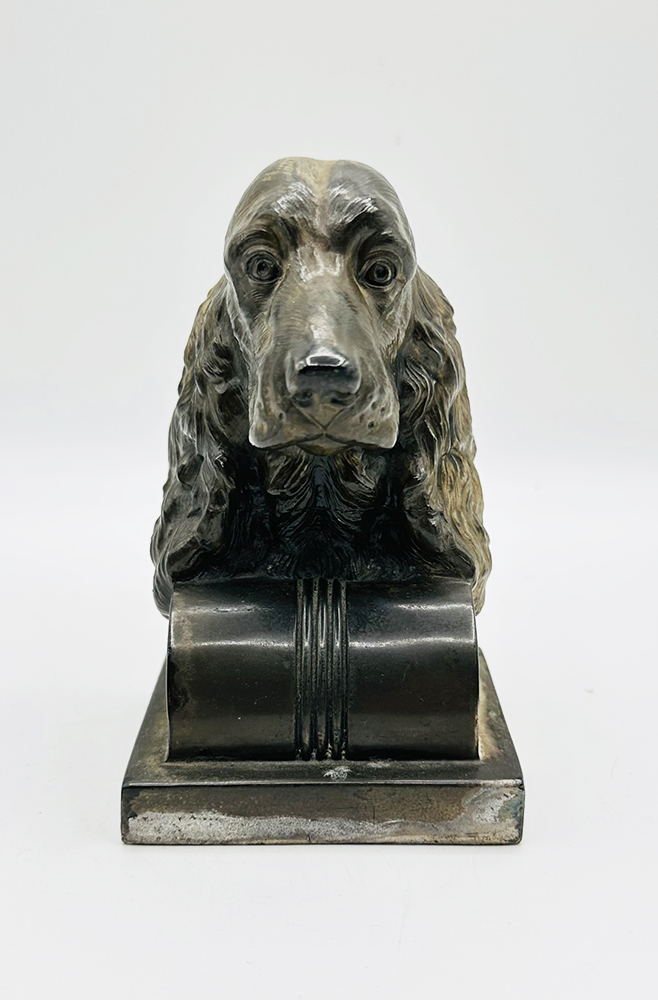 The Jennings brothers produced some of the most finely crafted art metal pieces during the 1920's and 1930's, and J.B. bookends are highly collectible. This exquisitely detailed bust shows off those "best in show" traits of long low ears, square muzzle, domed shaped head and that endearing expression. Stamped on the lower back" J.B. 1029". Measures 5" H x 3" W x 3" D.