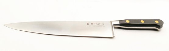 K Sabatier Forged Carbon 10" Chef's Knife. Full-tang with rounded classic French style bolster, durable POM handle and brass rivets. In Excellent Condition, possibly never used. In the original box. Cost - $115.