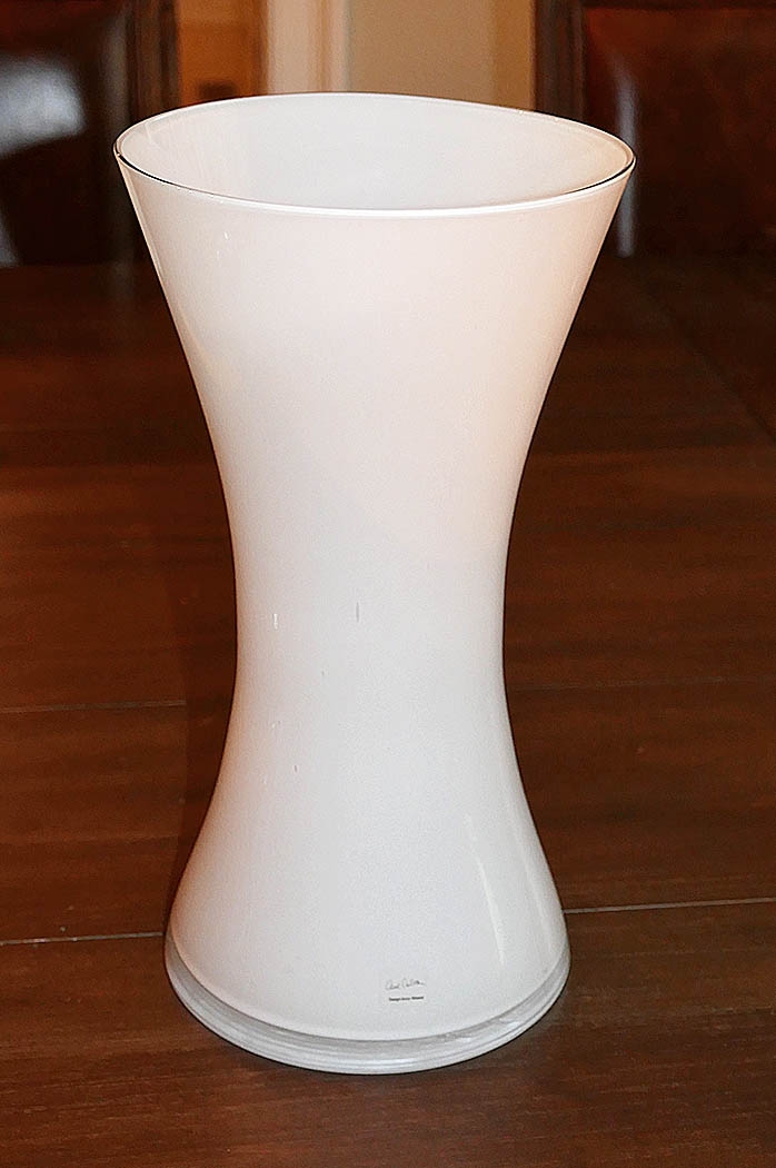 Anne Nilsson White Glass Vase. Elongated hourglass design. 12" Tall, 6.5" Diameter. In Very Good Condition.