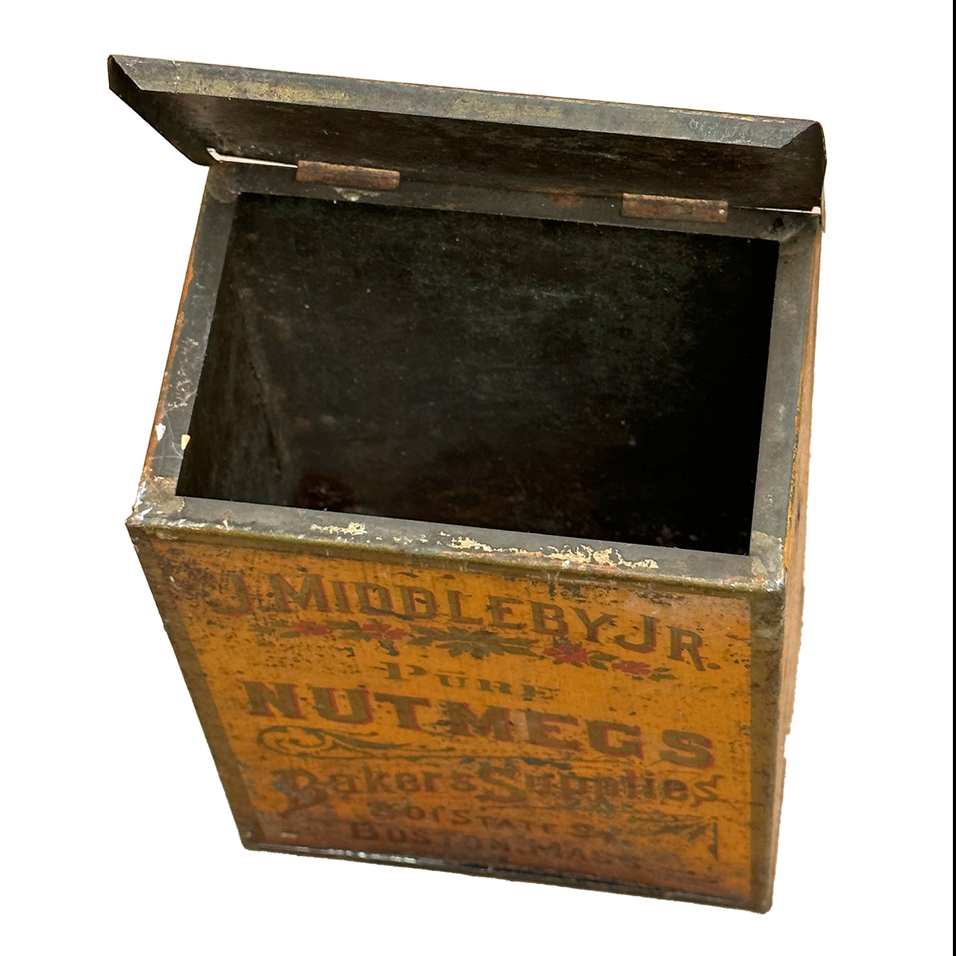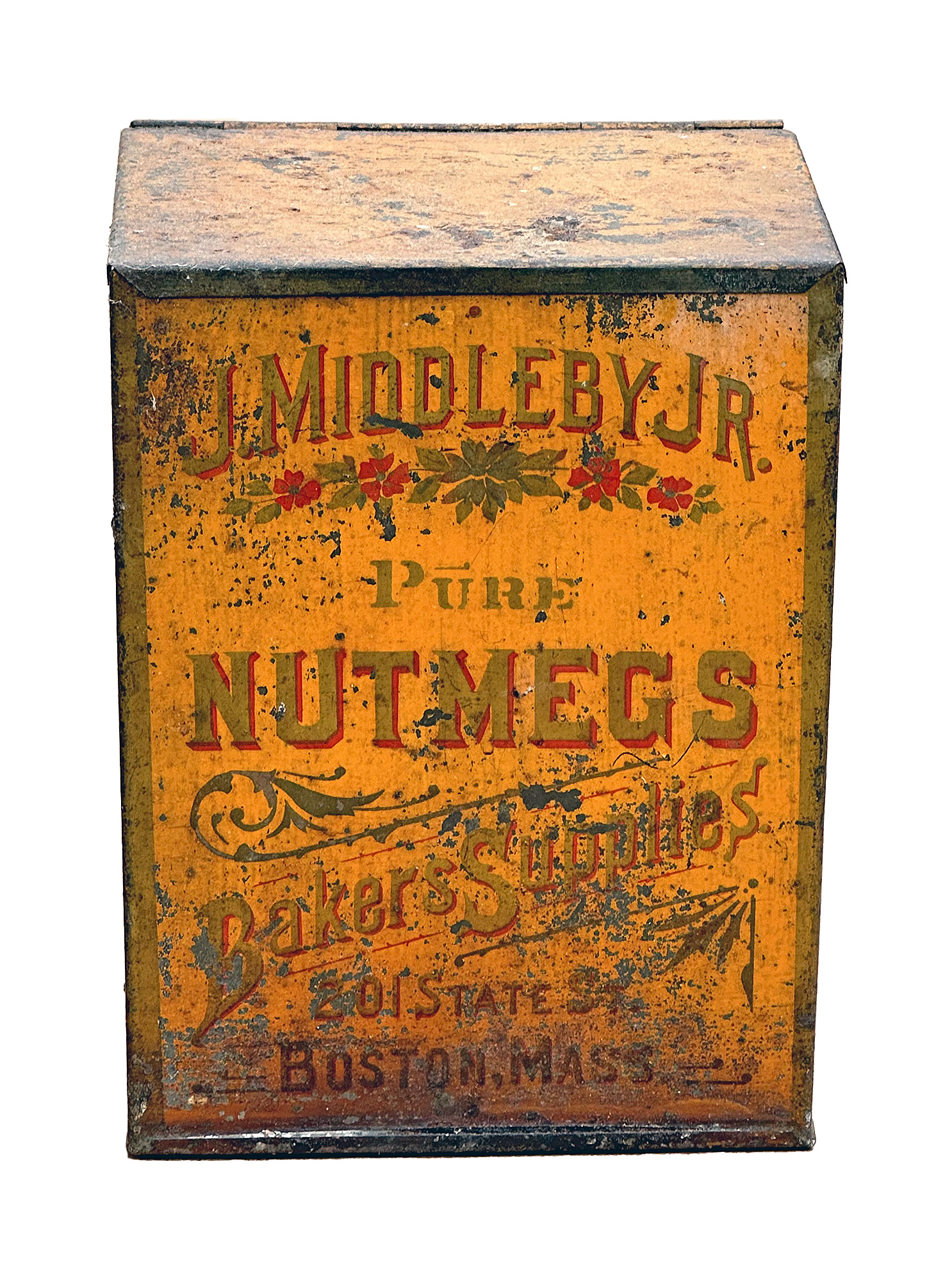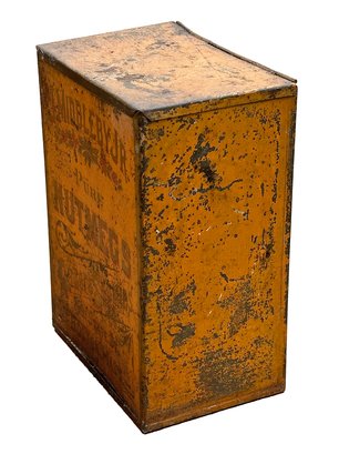 Large Antique Baker Supplies Tin - J. Middleby Jr (Boston, Mass) Pure Nutmegs. Circa 1900. 7.5" Tall, 5.625"w x 3.75"d. Nice colors. Great display piece.