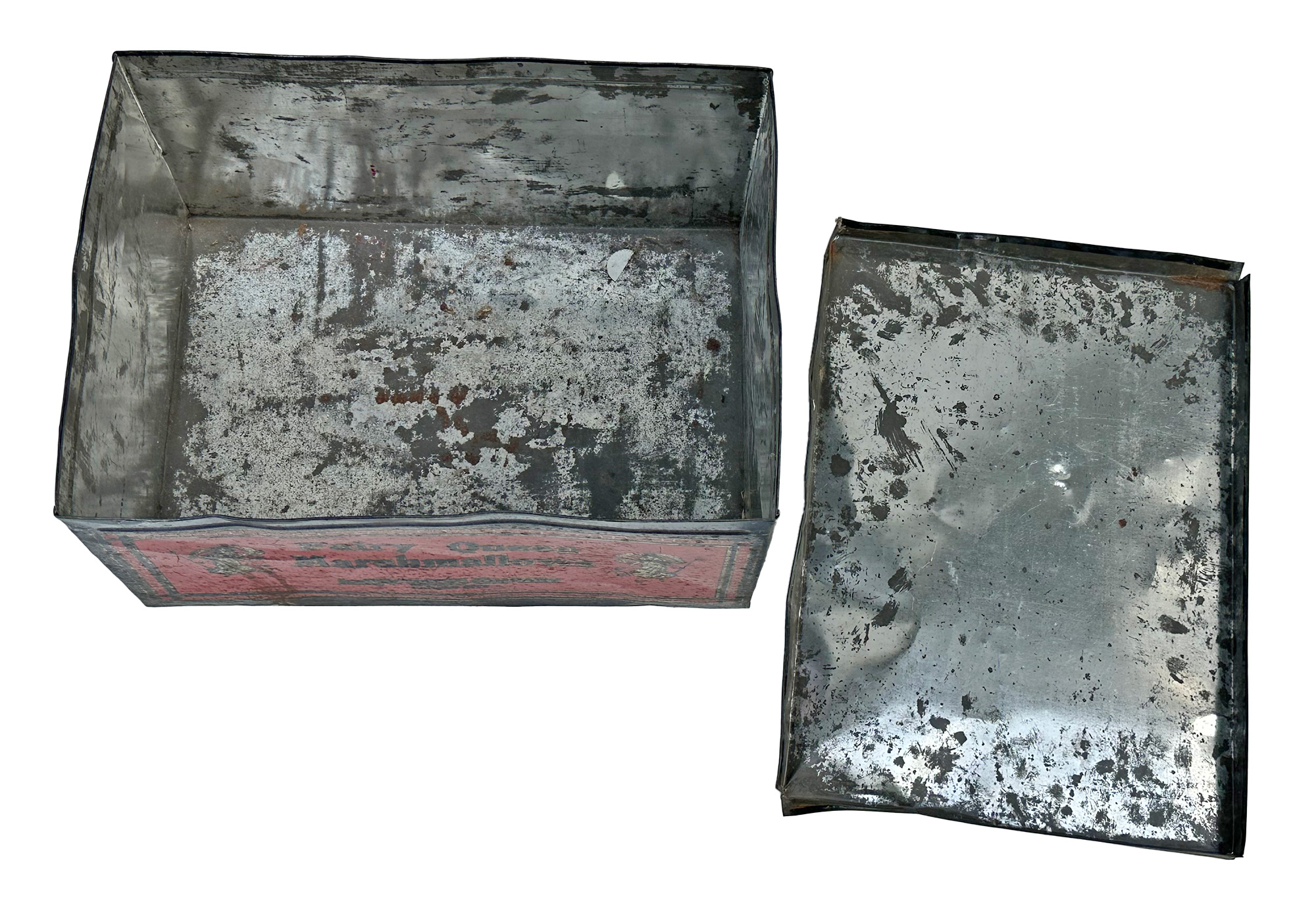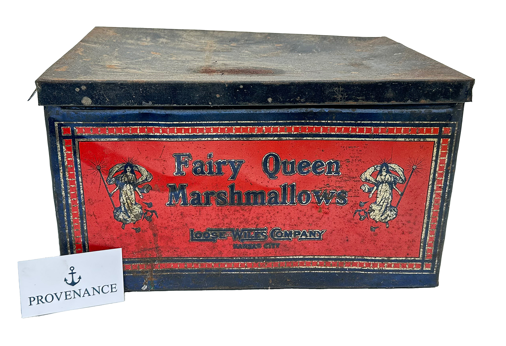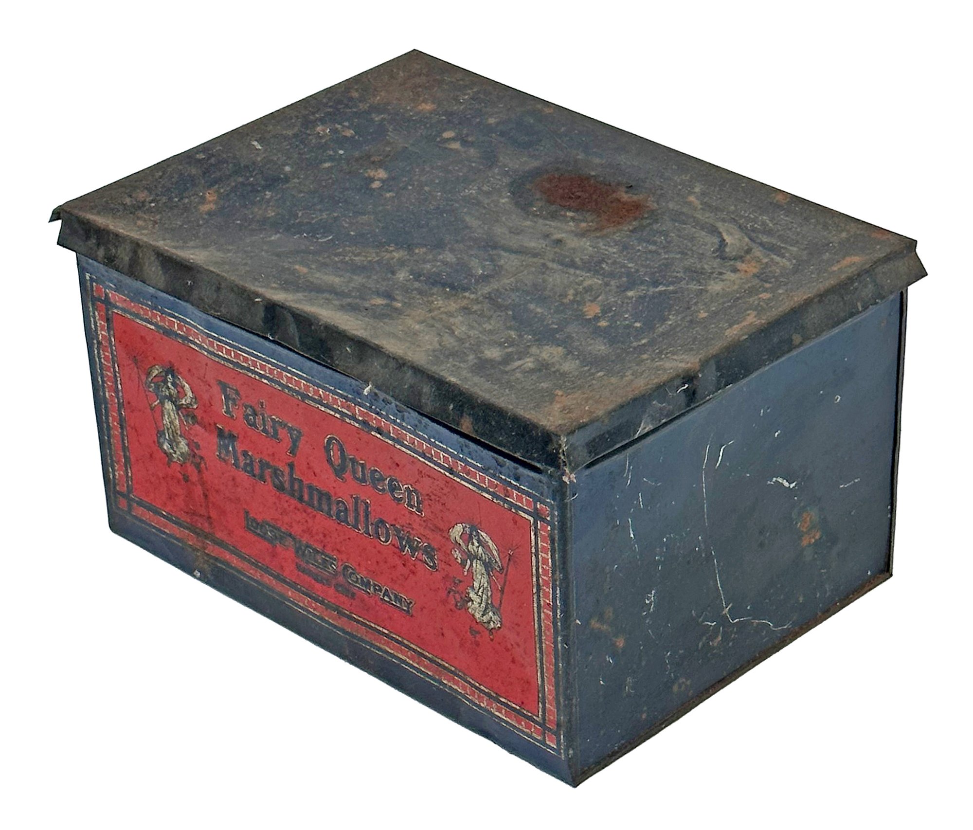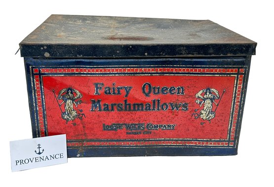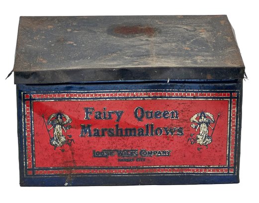 Large Antique Fairy Queen Marshmallows Tin (from the Loose-Wiles Company, Kansas City). Circa 1930's. Nice display piece with some wear and tarnish. 14.5"w x 10.5"d x 8.5"h