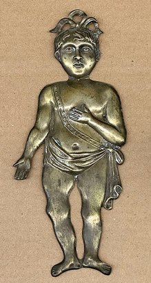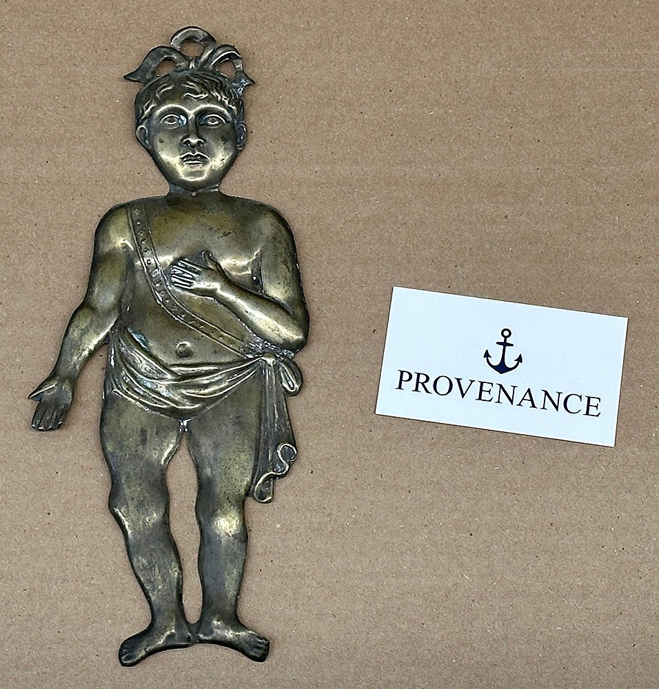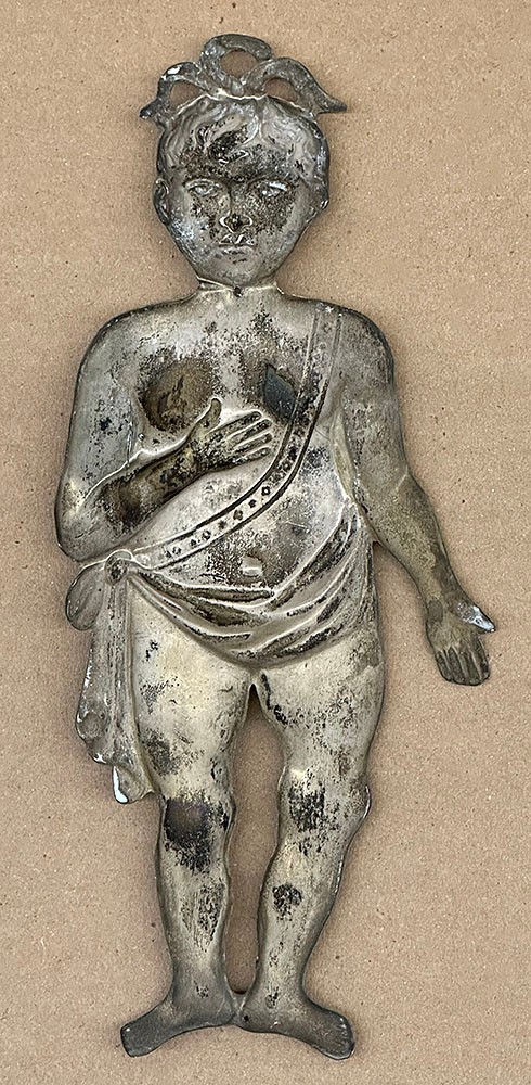 Antique Silver/Metal Catholic Italian Ex-Voto Baby. Circa Late 19th/ Early 20th C. These would be left at holy sites and places of worship as offerings to saints to represent a prayer for a miracle pertaining to a particular ailment. 10" tall.