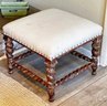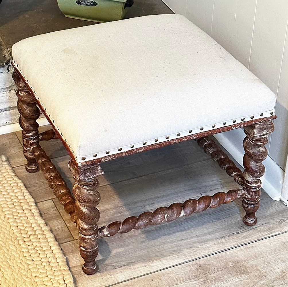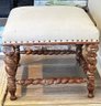 Large French Louis XIII Style Carved Stool. In good condition with a couple light stains in the upholstery. 20" x 20" x 18"h.