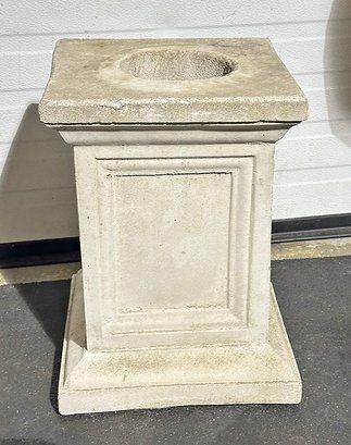 Large Outdoor Concrete Garden Plinth / Stand. 17" Tall, 112" Square. It has one damaged base corner; everything else is in very good condition.