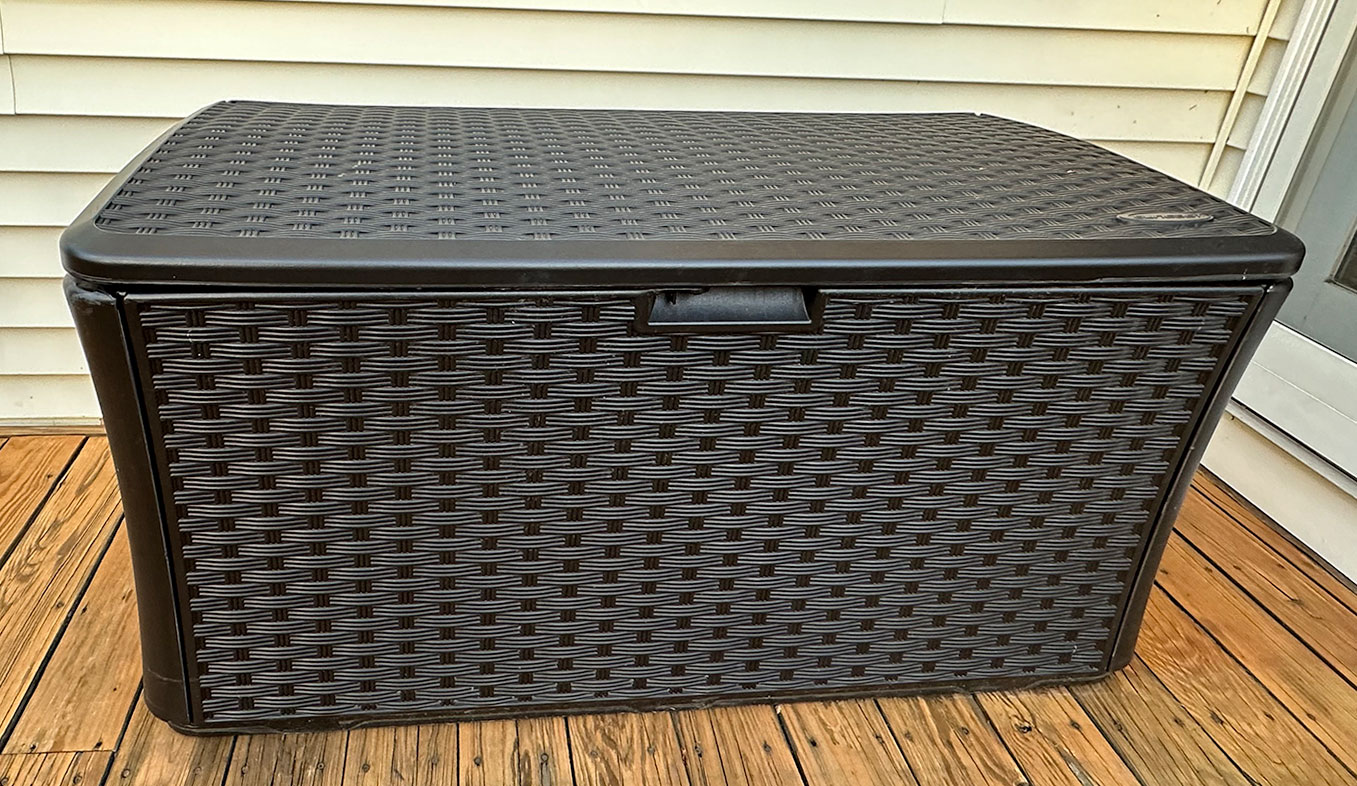 Large Suncast 134 Gallon Resin Wicker Deck Box. In Java. 54" x 28" x 27"h. In Very Good Condition. The original cost was $200. There are two available in this auction, this lot is for one (1).