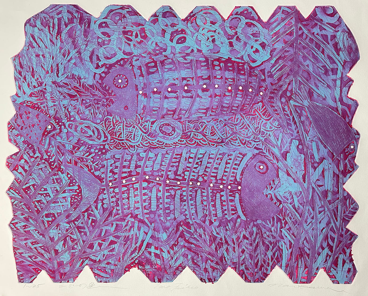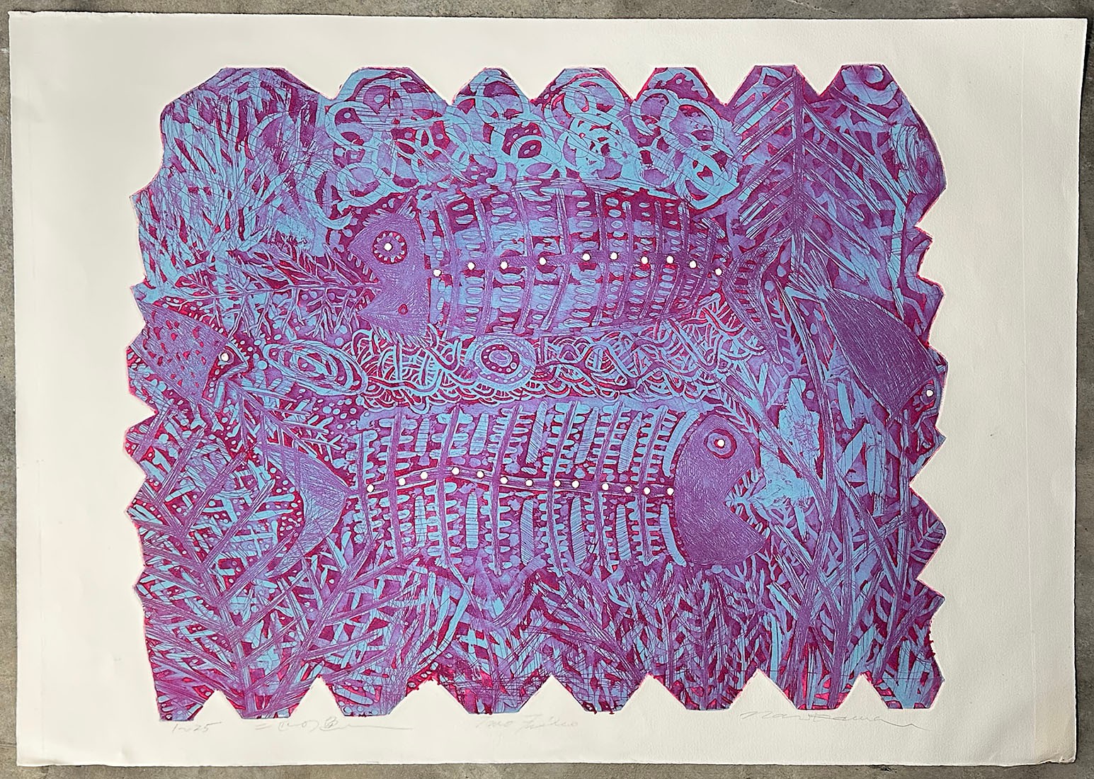 1970's Shigeru Narikawa (Japan, B. 1946) Aquatint Etching "Two Fishes". Signed and Titled in pencil by the artist. Edition Size: 25. In Good Condition. Unframed. Great Colors. Measurements: 27" x 38.5" (paper)