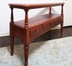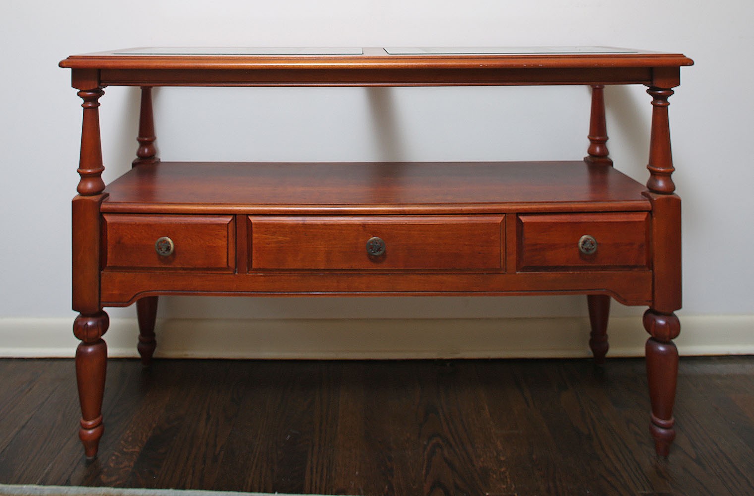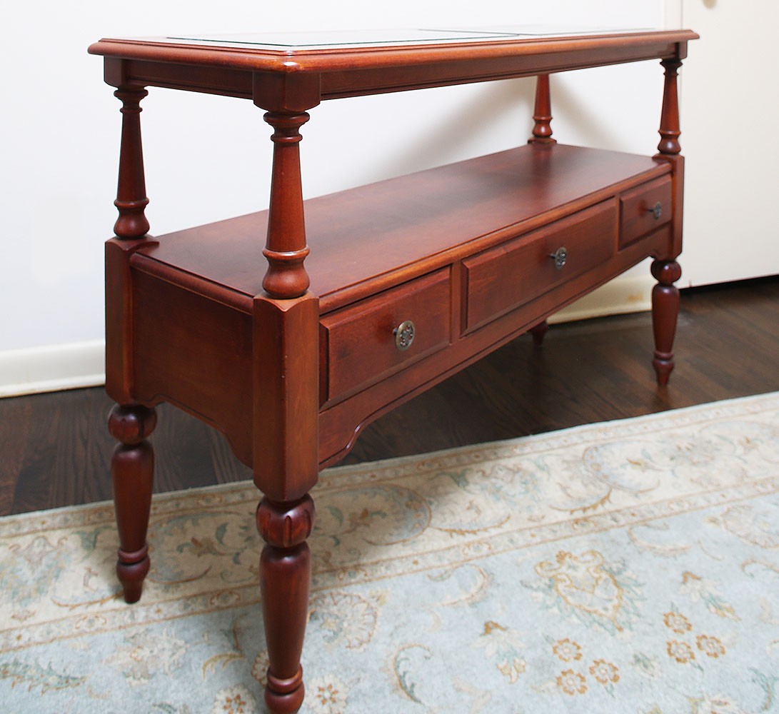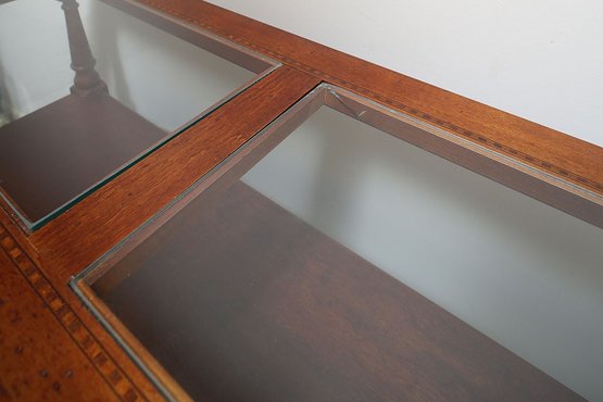 Glass Top Console Table. 50"w x 17"d x 32"h. In good condition with a small crack in one of the top glass panels.