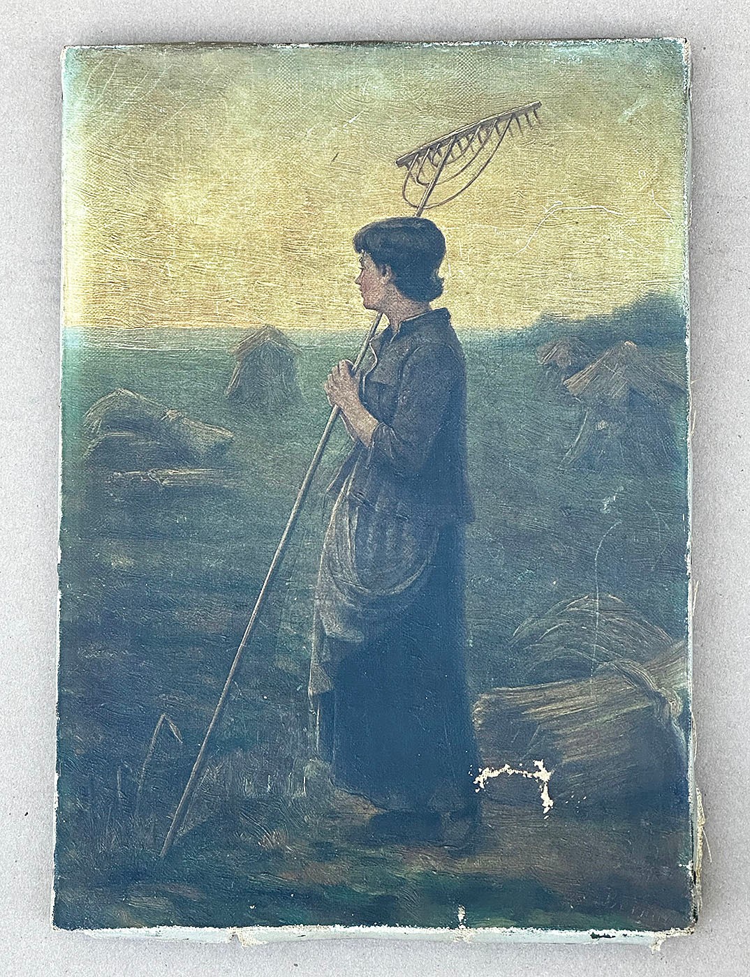 Late 19th C. Original Oil On Canvas - Haymaker. Circa 1880's-1890's. 10" x 14" Canvas Size. Unsigned. Some paint loss and cracking.