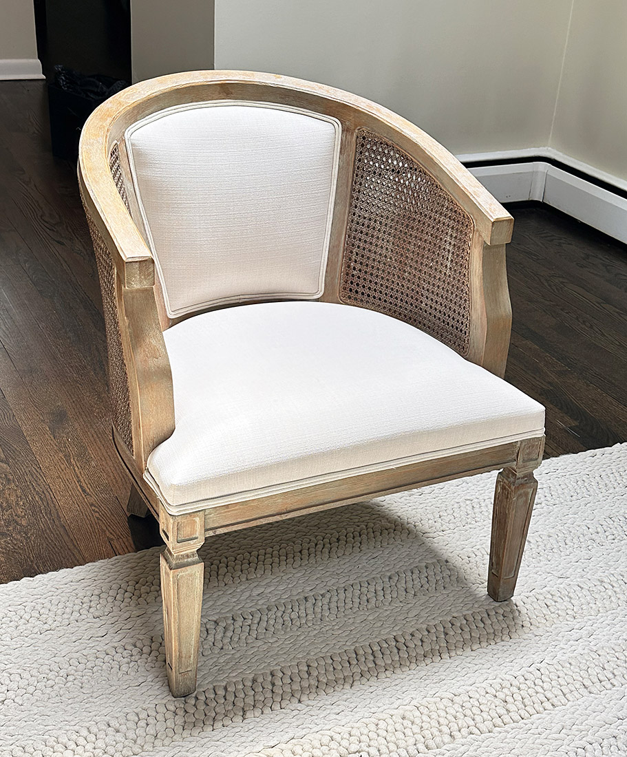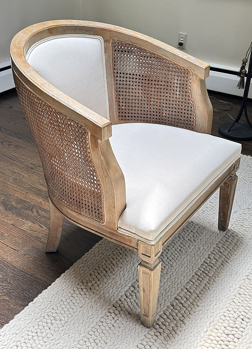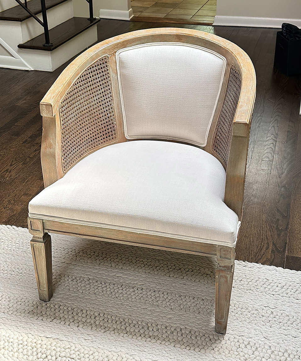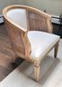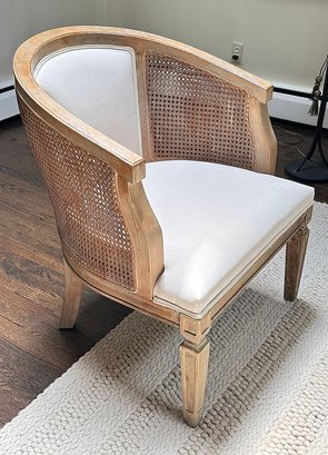 Linon Kensington Grey Wash Accent Chair. Wood construction with a curved back, cane detailing, and decorative legs. In Very Good Condition. The original cost was $550. Measurements: 27" x 28" x 23"h