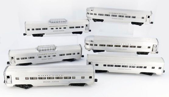 6 Vintage Train Cars - Lionel / Williams 2530 2532 2533 2534 Silver Range Cloud Bluff O Train Cars - Illuminated Pullman/Astro Dome. 6 Cars in total. Includes two 2530 REA Baggage Cars (Lionel & Williams), a Silver Range Vista Dome Car, two Silver Cloud Pullman Cars, and a Silver Bluff Pullman Car. In Good/Very Good Condition.