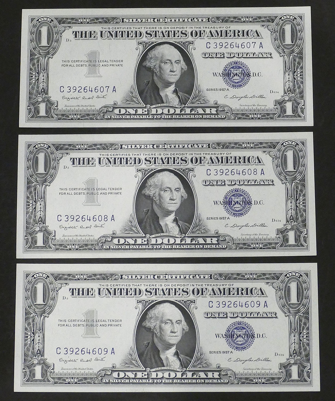 Lot Of 3 - 1957A $1 Bill Silver Certificates. With Consecutive Serial Numbers. In Crisp Uncirculated Condition.