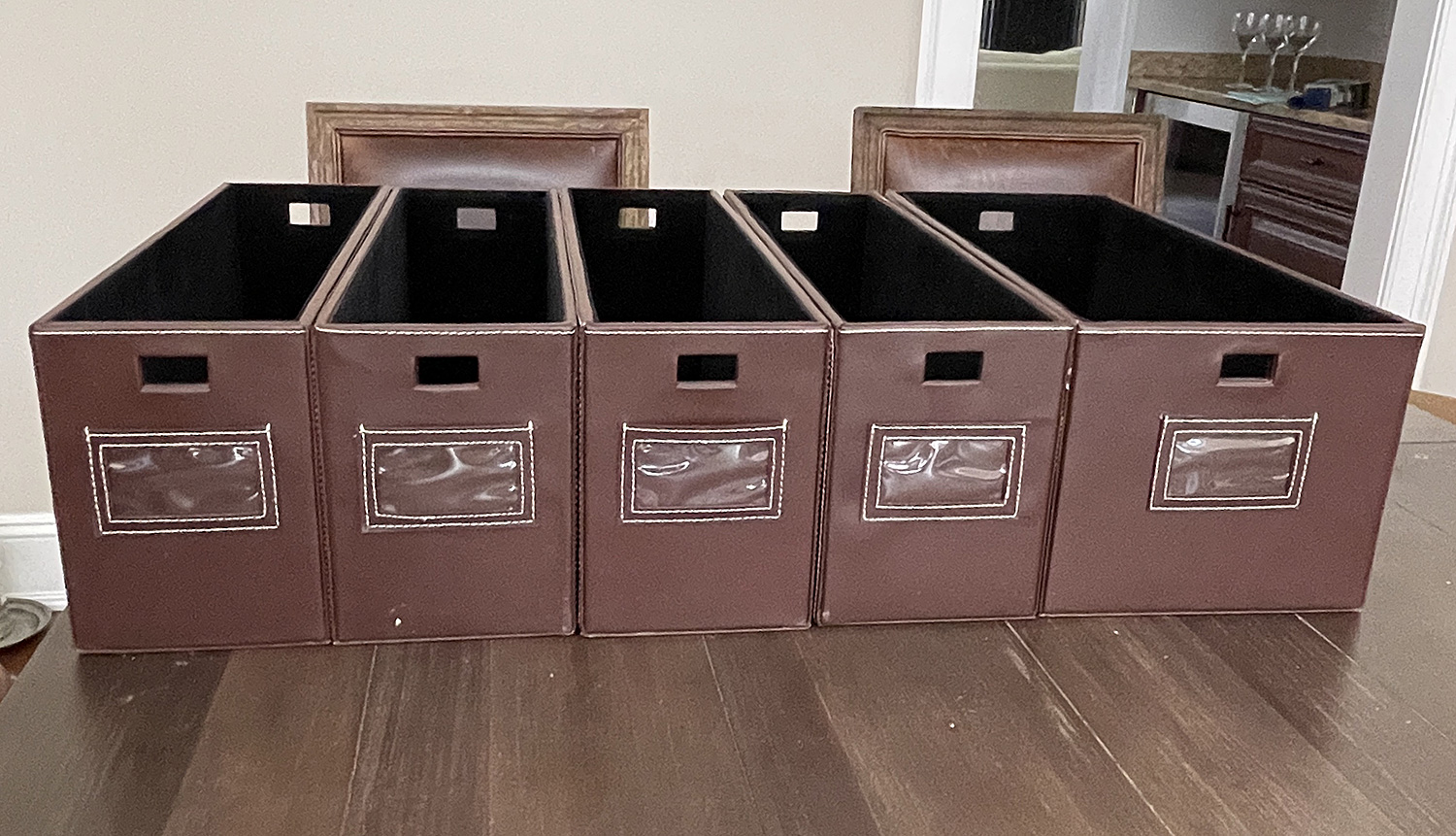 Lot Of 6 Storage Boxes In 2 Different Sizes (5 are photographed but we found another one in the larger size). They're not marked so we're unsure if they're leather wrapped or faux. All appear to be in good condition.