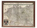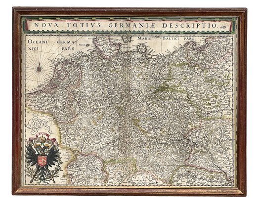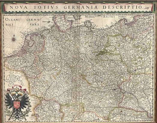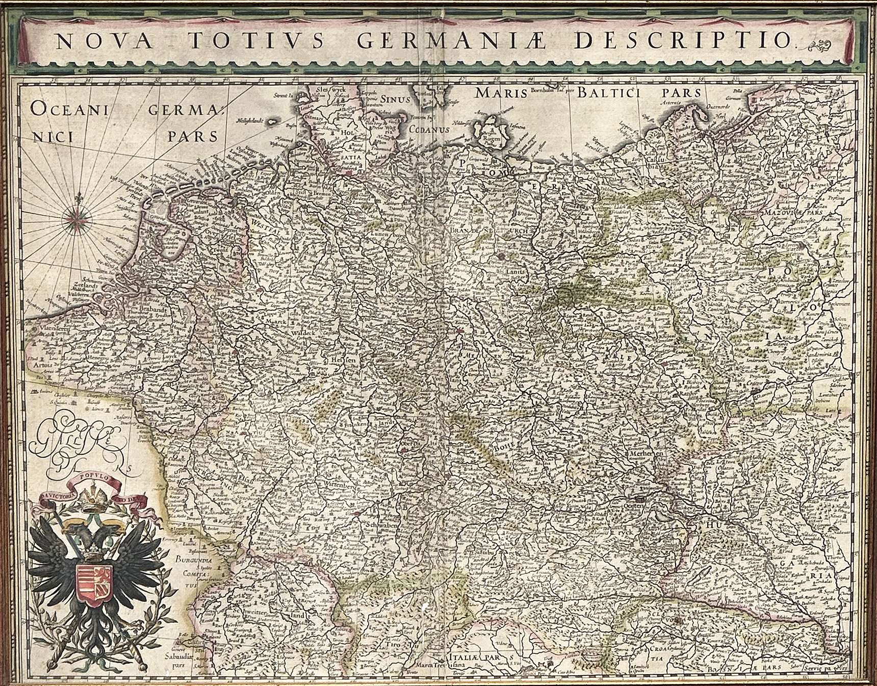 Circa 1640's-1650's colored map of Germany by Willem & Joan Blaeu. Decorated with a large