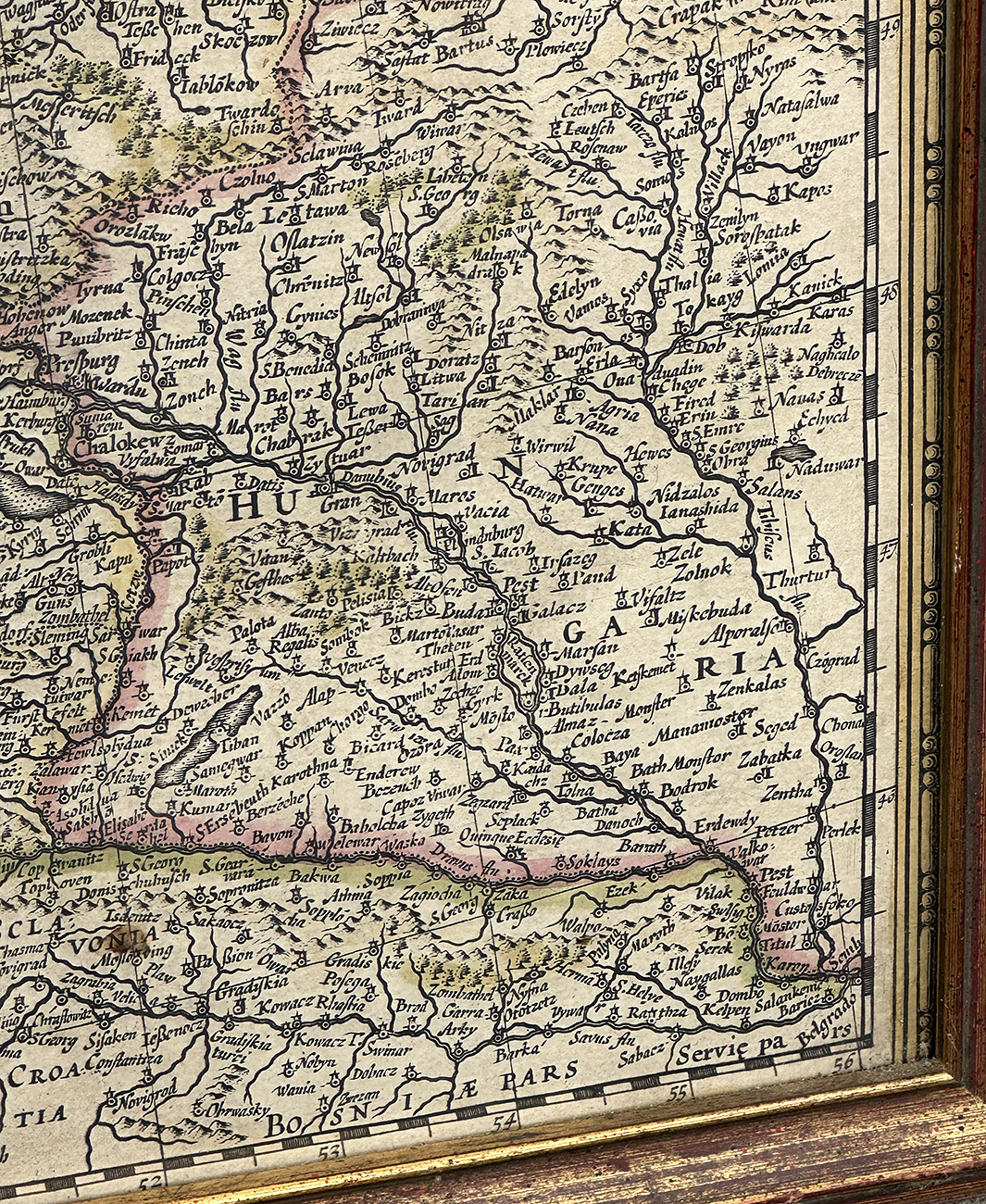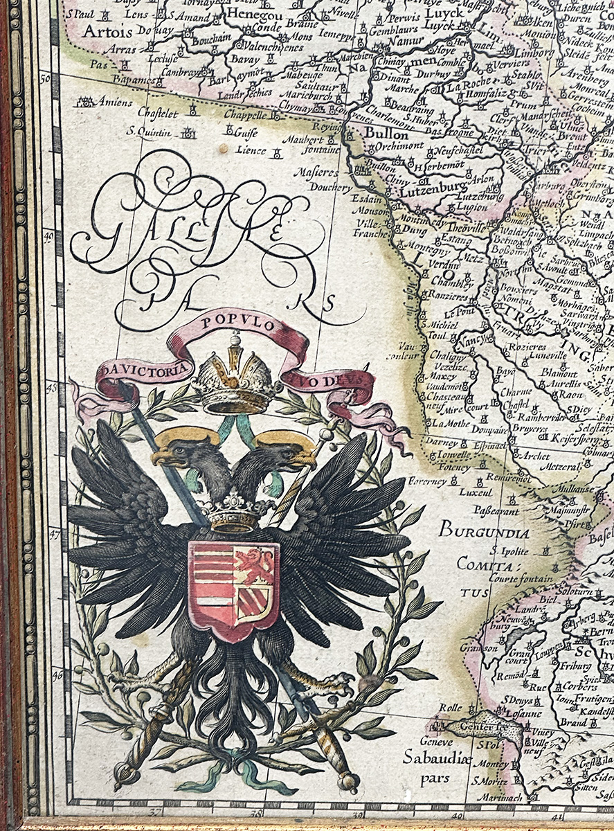 coat of arms and a compass rose. From one of the two Latin editions of the Theatrum orbis terrarum, sive Atlas novus from 1644-55. In an old frame. Map Size 15.5" x 19.5" / Frame Size 16.875" x 20.875"