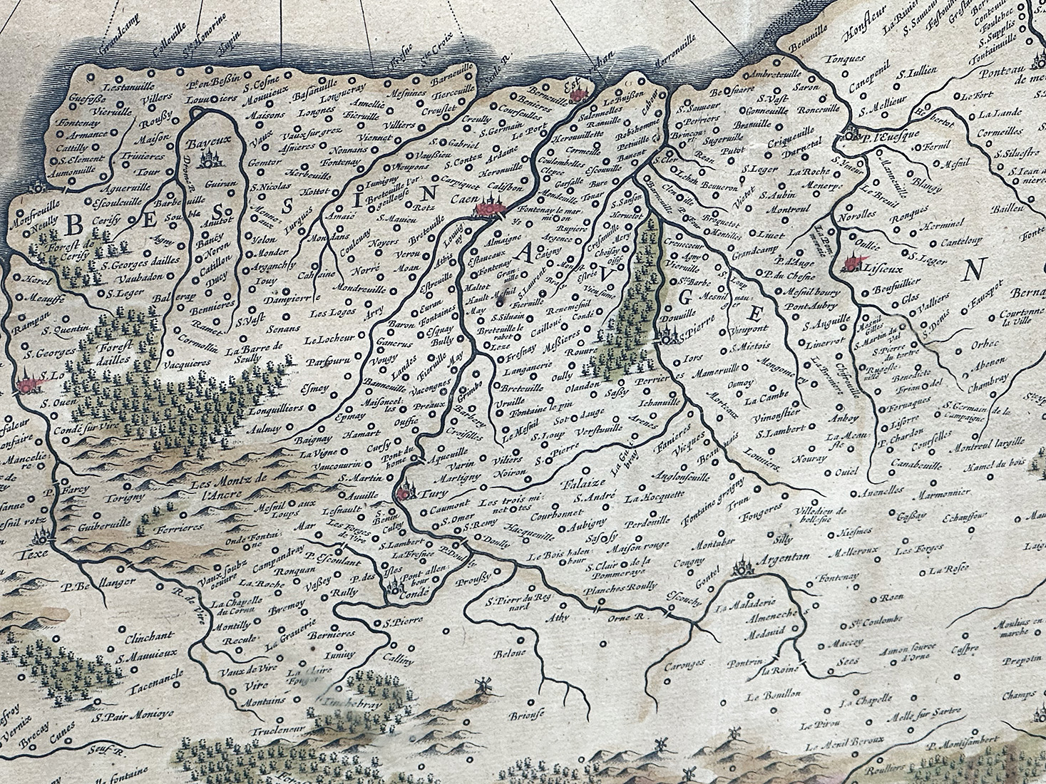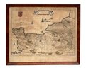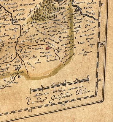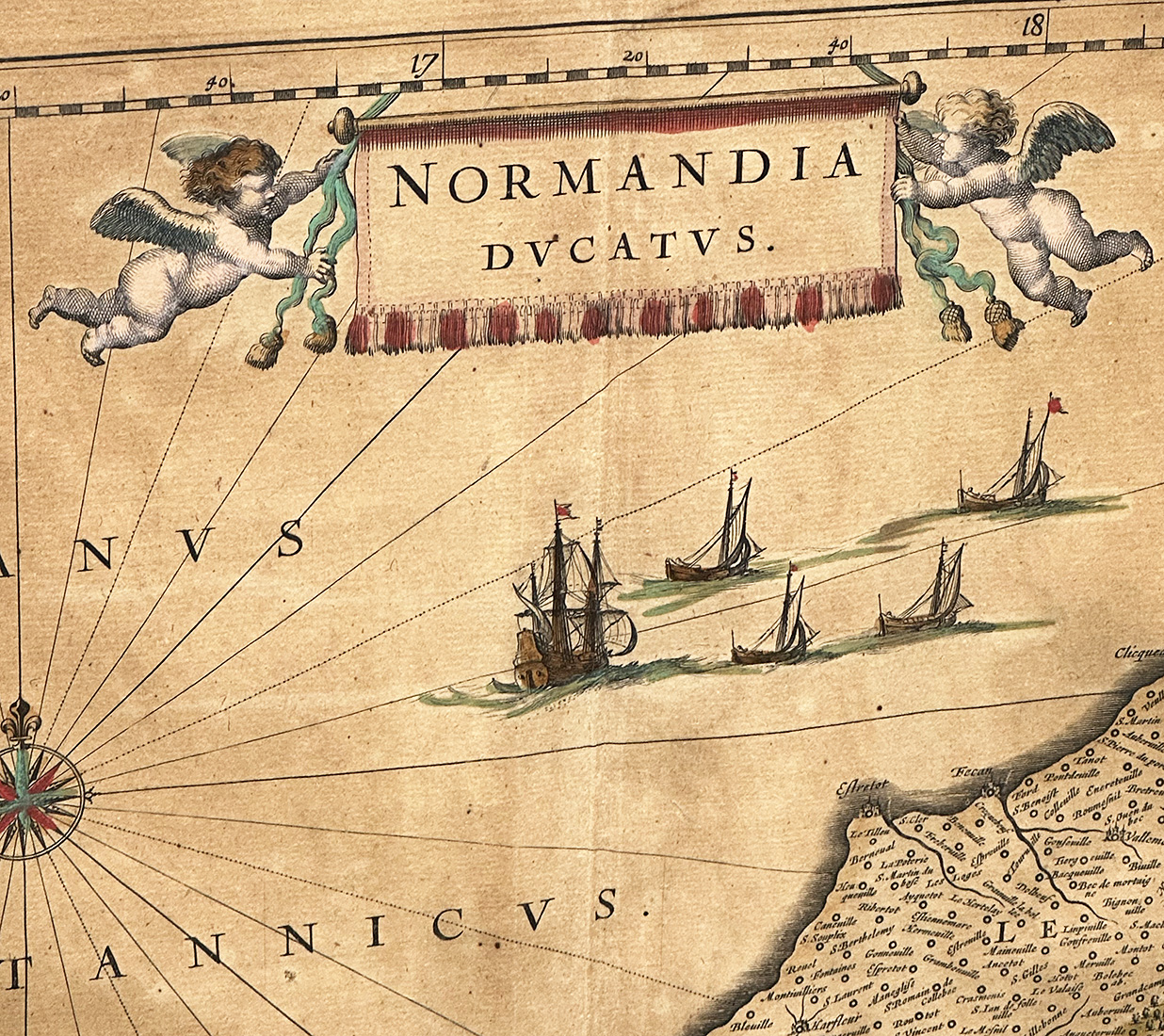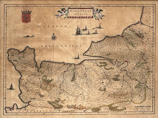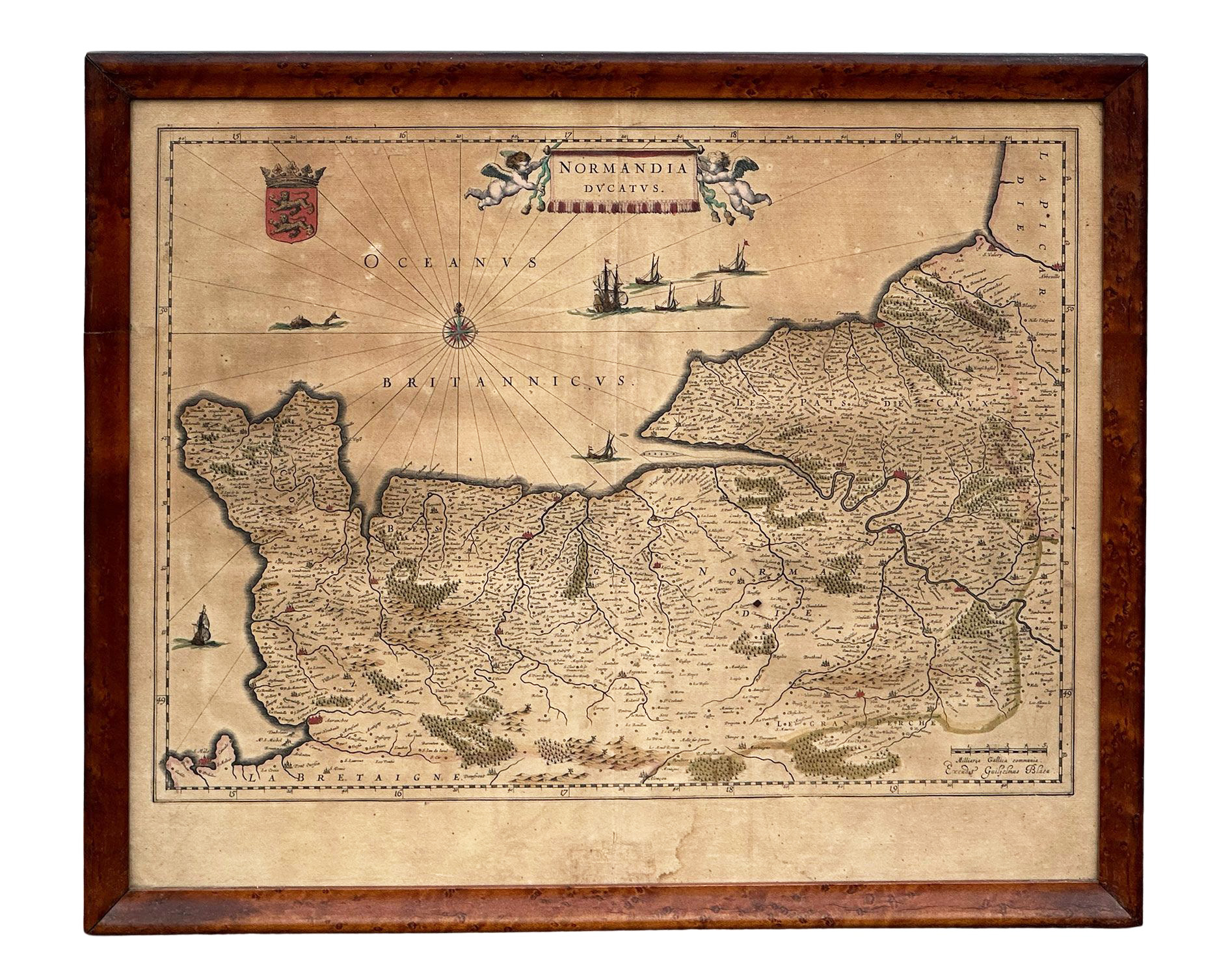 Circa 1635 colored map of Normandy (Normandia Ducatus) by Willem Blaeu. Copper engraving, printed on paper. Publisher - Amsterdam: Excudit. In an old frame. Frame Size: 19.5" x 23.625"