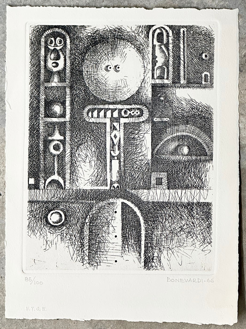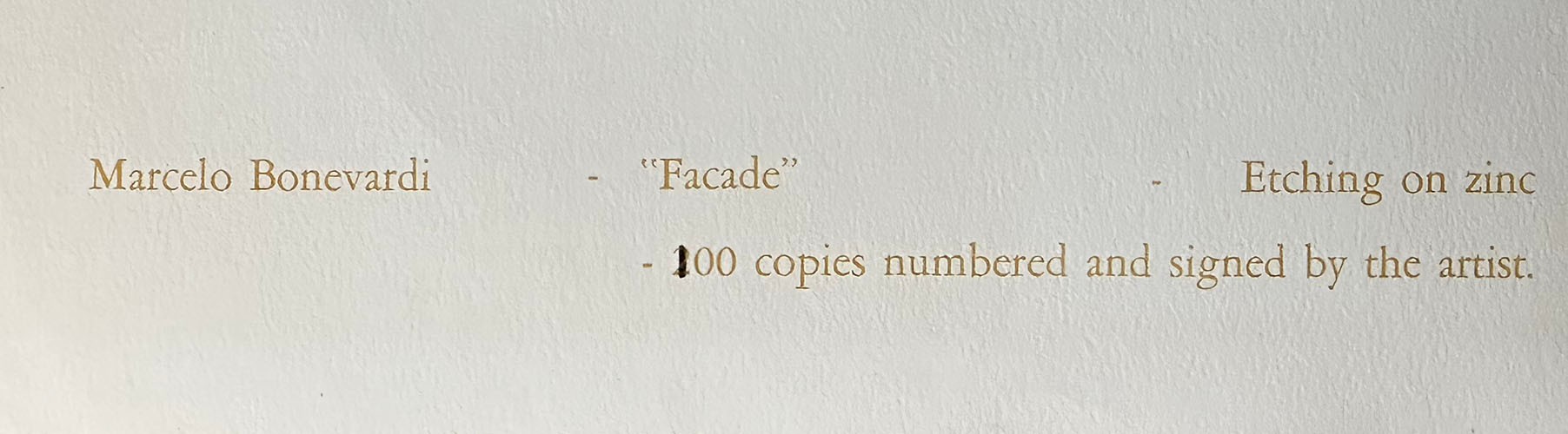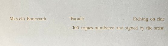 Marcelo Bonevardi (Argentinian, 1929-1994) Etching "Facade". Circa 1967. Signed and numbered in pencil by the artist. Edition Side: 100. From Galeria Bonino (NYC) and comes in a folder. 8" x 11" (paper). In Very Good Condition.