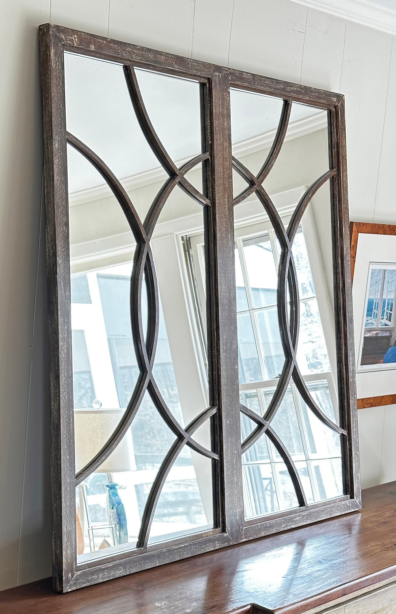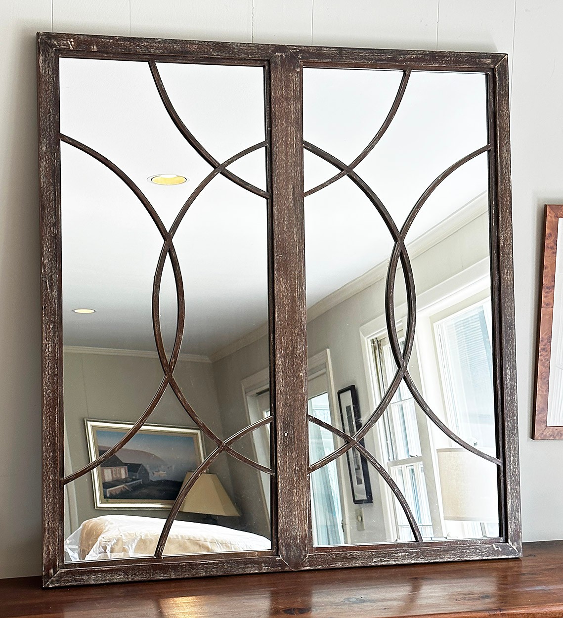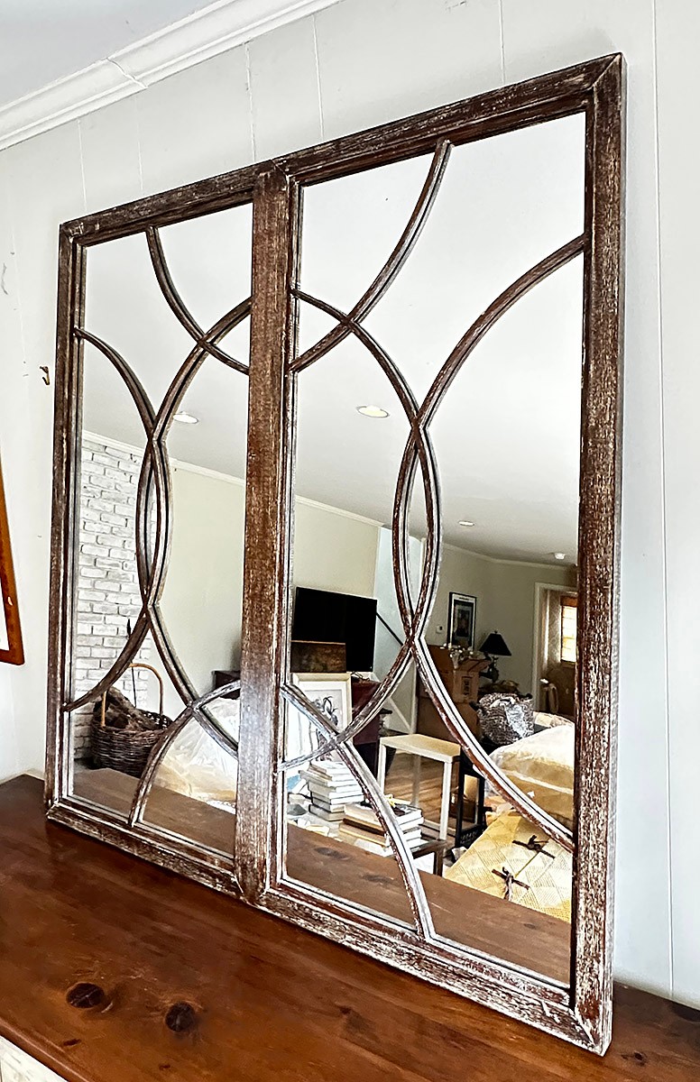 Mitchell Gold + Bob Williams Wood Framed Wall Mirror. Nice distressed finish; In Good Condition. 39" x 42.5"
