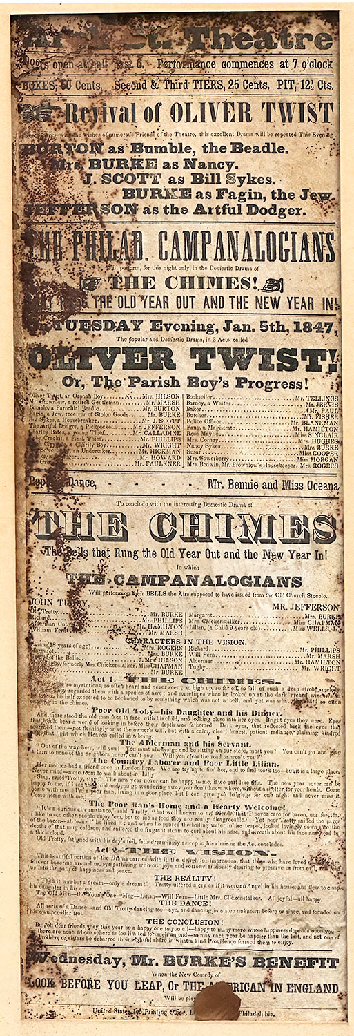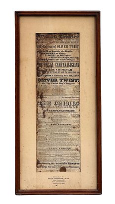 Original 1847 Broadside Theater Playbill - Oliver Twist - Gifted To Philip Leserman the 3rd (Vanderbilt) in 1933. Playbill and frame are in poor condition. 12.5" x 25.7" (Frame Size)