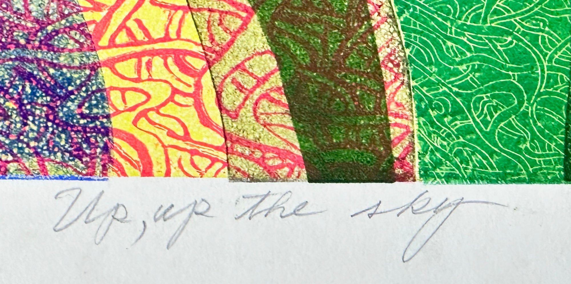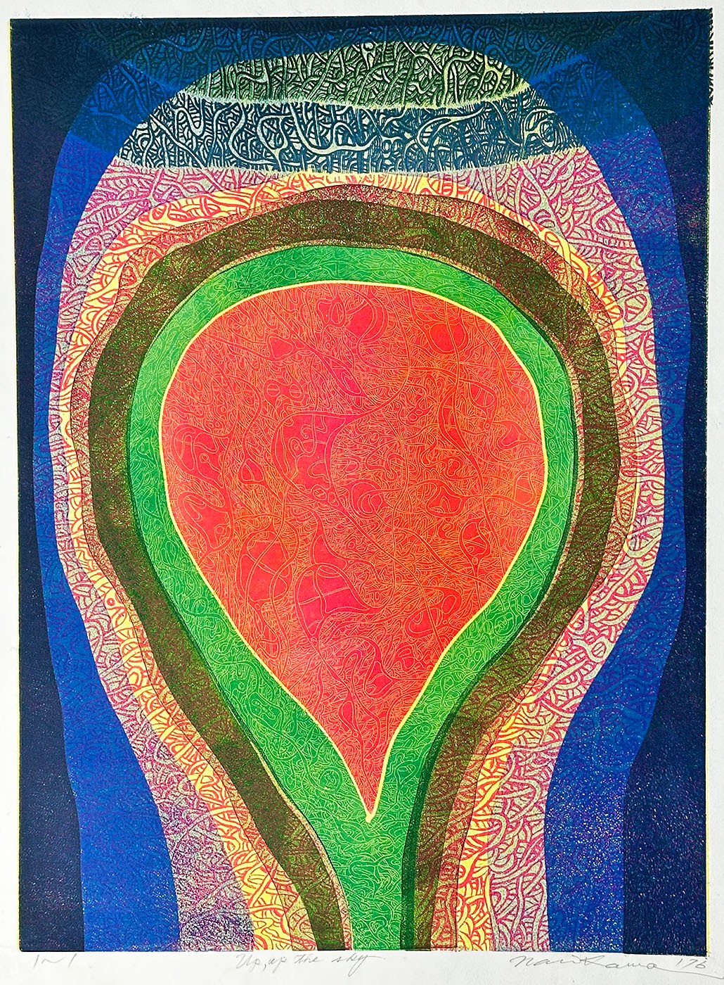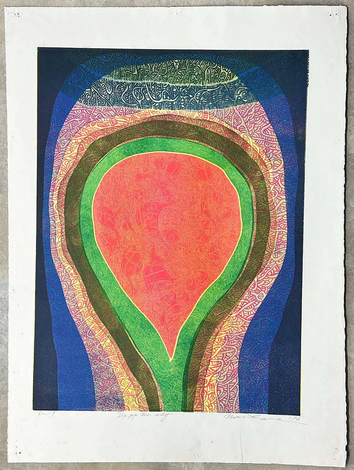 Original 1976 Shigeru Narikawa Aquatint Etching "Up, Up The Sky". Only one was created. Signed and Titled in pencil by the artist. In Good Condition with some paper browning. Unframed. Great Colors. Measurements: 29.5" x 22" (paper)