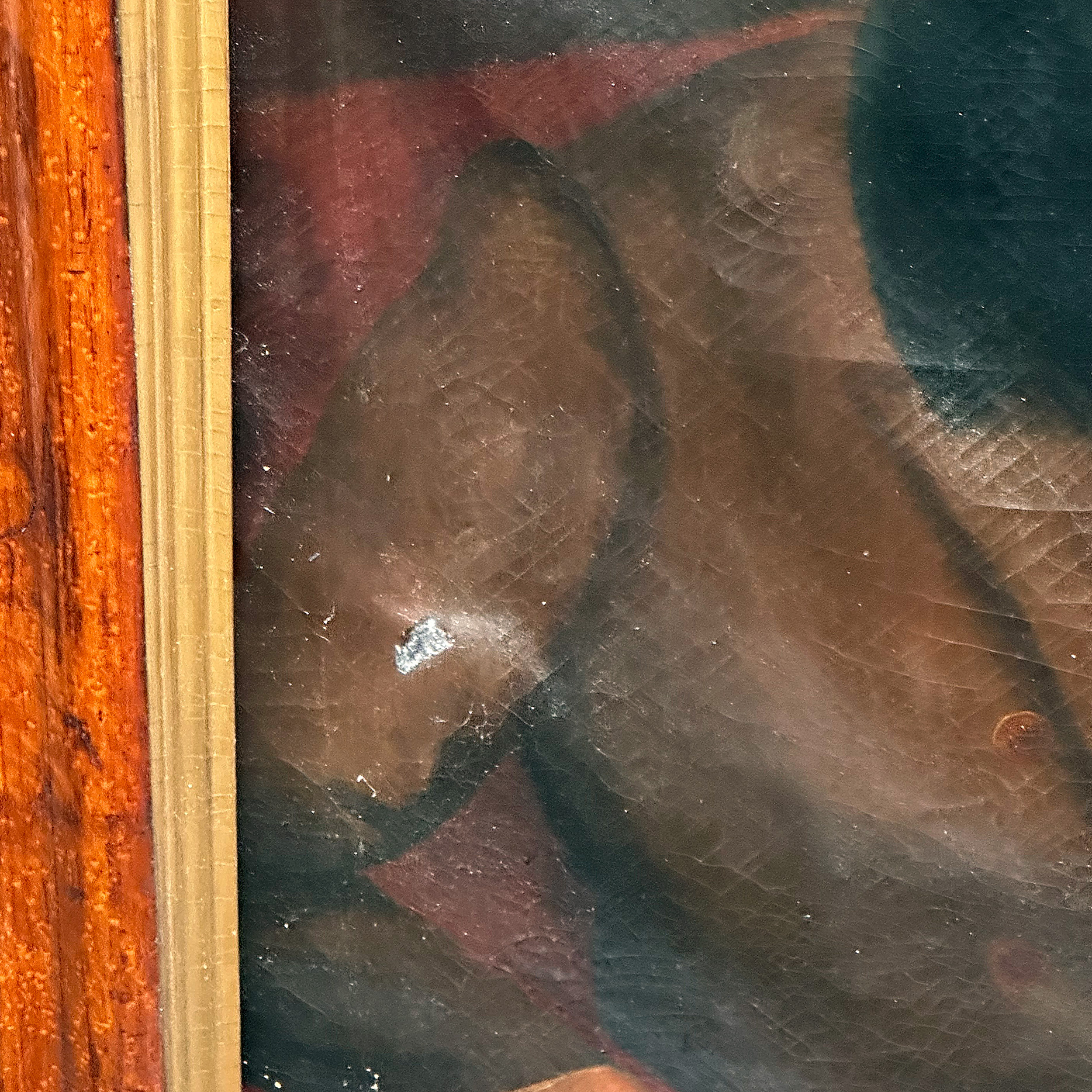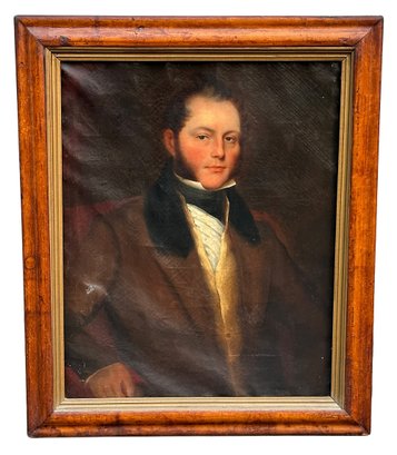 Original 19th C. Oil On Canvas Painting - Portrait Of A Gentleman - English School. Wearing a brown jacket. In fair condition with a small hole/repair of mid right side, loose canvas, and craquelure.