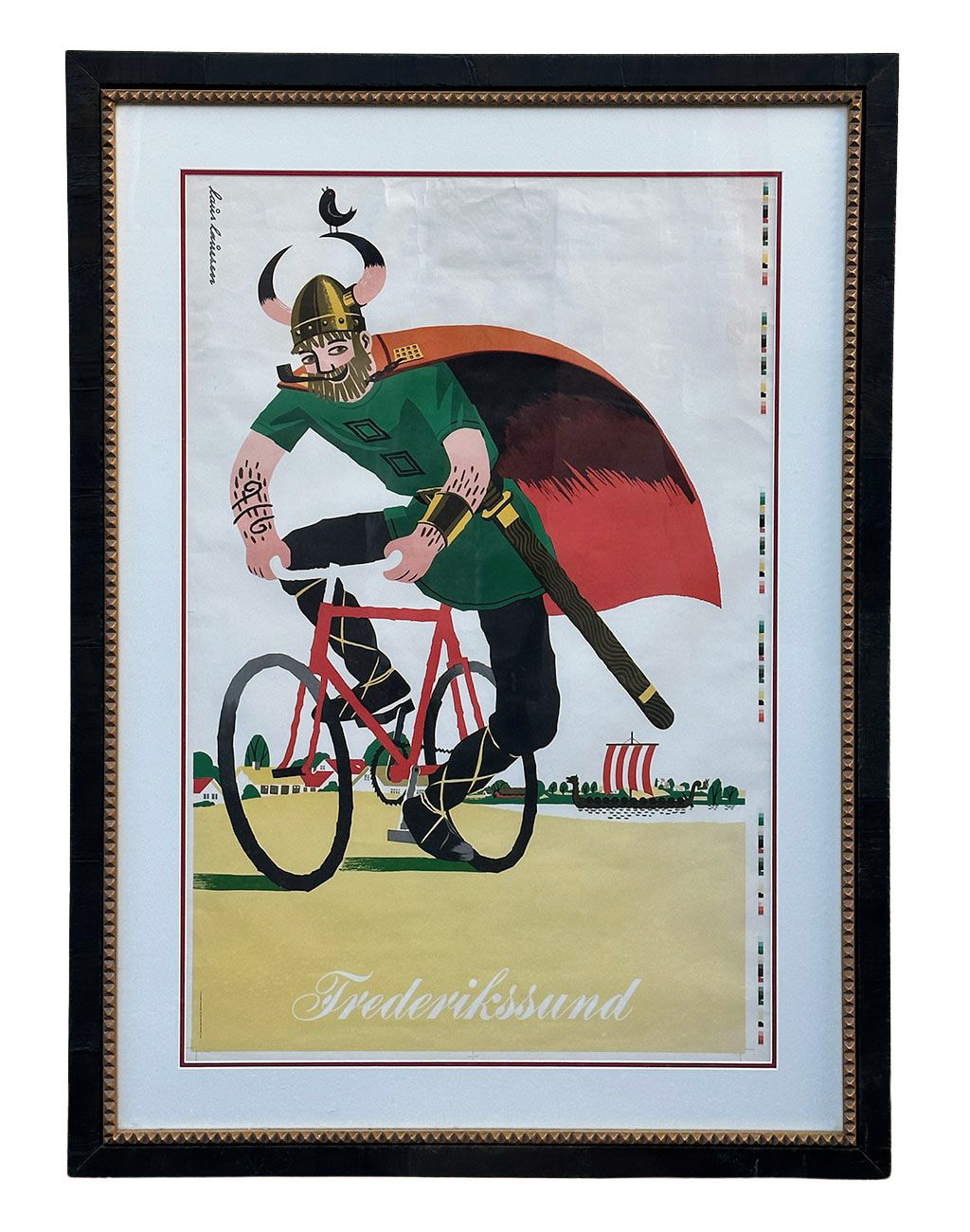 Original Vintage Travel Poster From Laus Lauesen (1914-1966) - Frederikssund, Denmark. Circa 1950's. Created for The Viking Pageants in Denmark. Nicely framed and in Good Condition. Framed Measurements: 37" x 50.5".