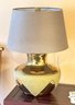 Oromaya Table Lamp by Arteriors. The base is made of ceramic with a warm brass tone. Well made and in Excellent Condition. 17" diameter, 25" tall.