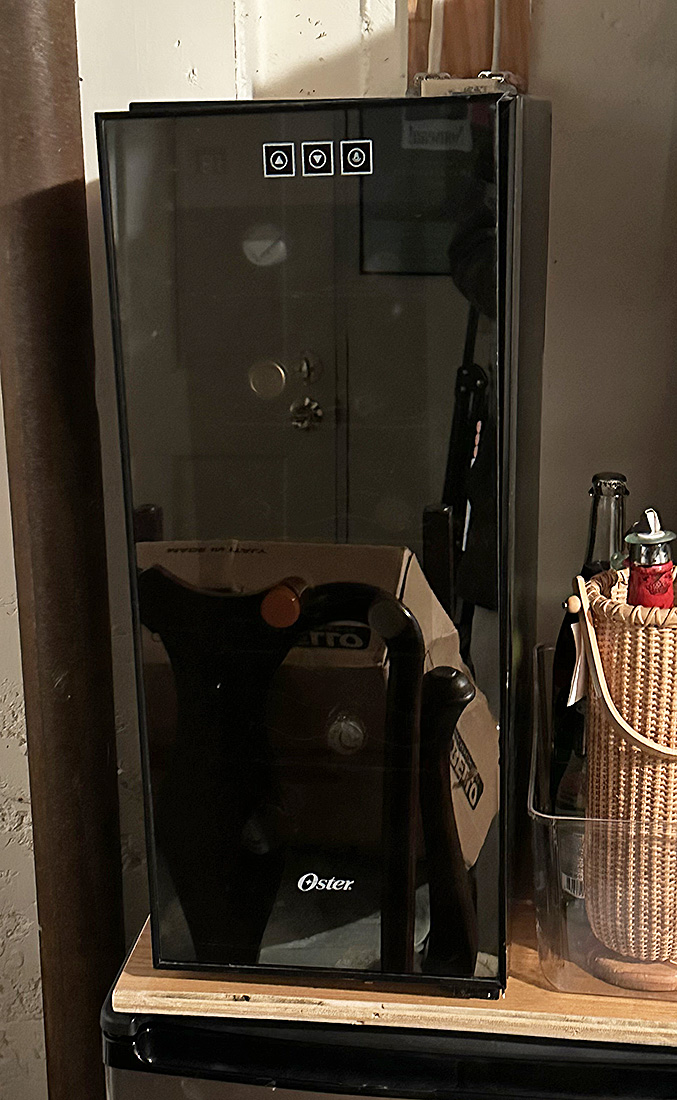Oster 10-Bottle Wine Fridge. 25"h x 10.5"w x 20"d. In working condition. Some wear, the front door is a little crooked.