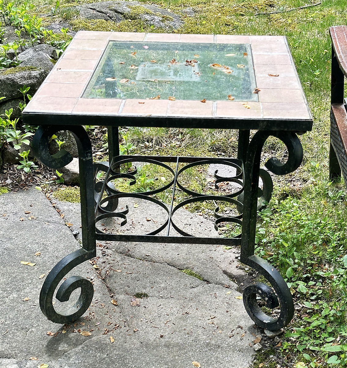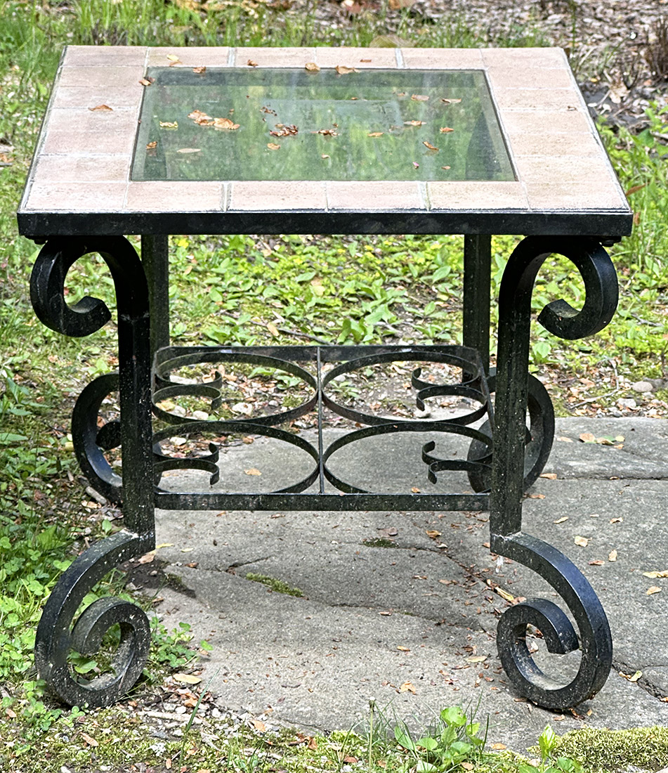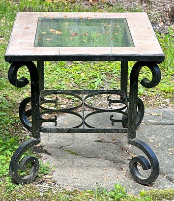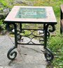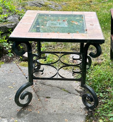 Outdoor Metal, Tile, and Glass Side Table. In good condition with some light paint wear. 28.5" x 24.5" x 23.5"h