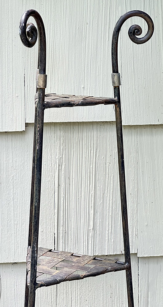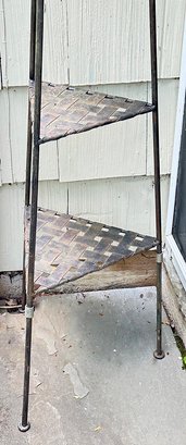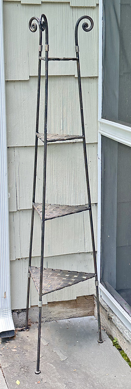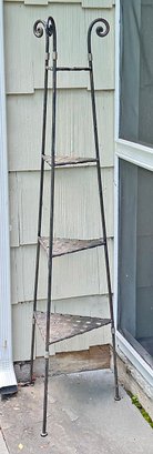 Outdoor Wrought Iron Plant Stand. 4 Shelves; 64" Tall. Nice outdoor weathered patina. 13" x 13" x 64"h
