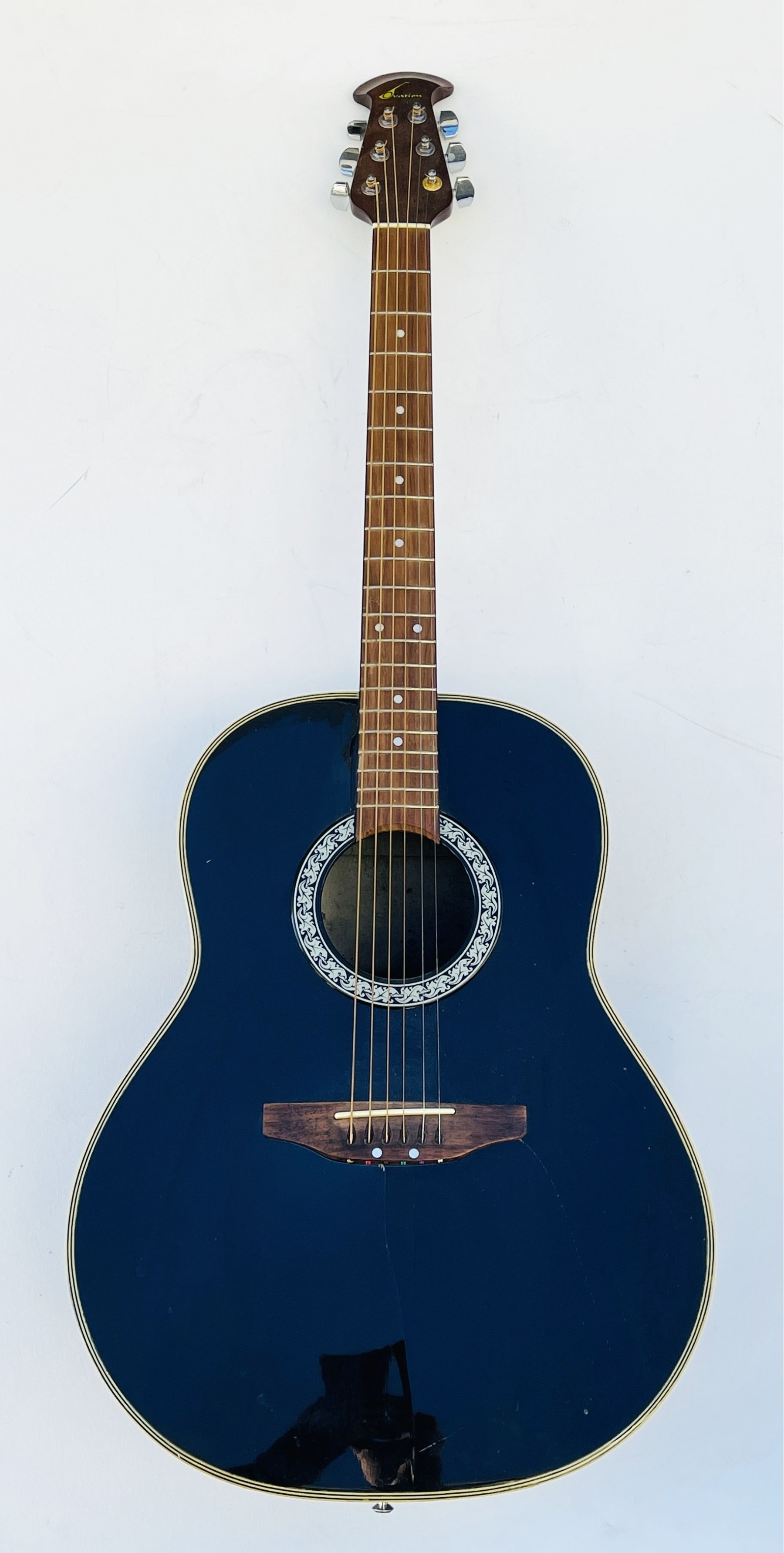 Ovation acoustic guitar with curved composite back. In good playing condition. 41 inches tall. Some finish cracking on front and marks on the back.
