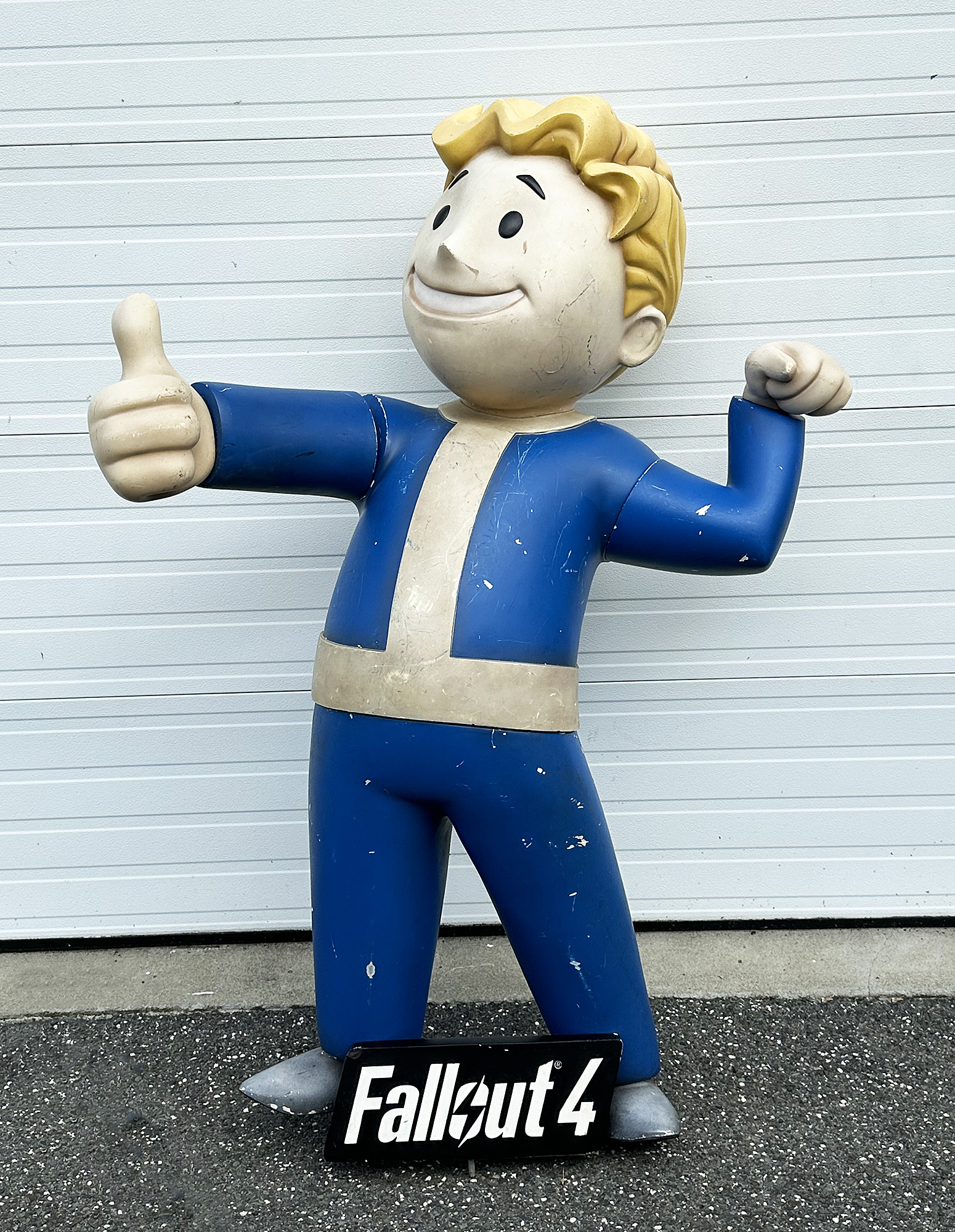 Rare Fallout 4 Vault Boy Life Size Store Display / Statue. 6FT Tall, 4FT Wide. Video Game Display. From Bethesda Software. Some marks and paint loss; missing the base. Metal post attached to head is inside the head. From 2015. Probably only a few dozen made.