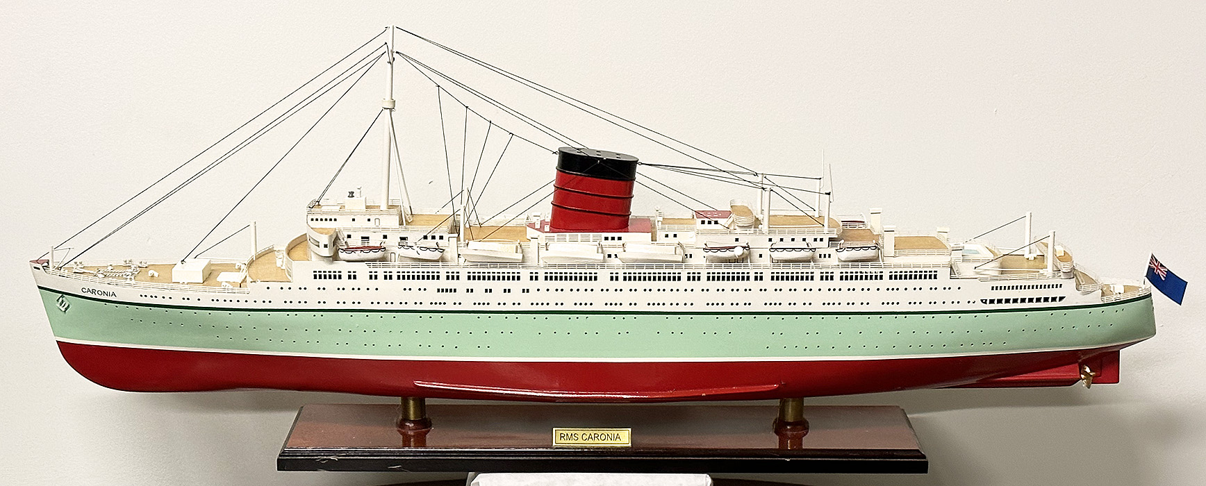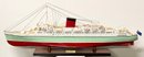 RMS Caronia Wooden Ship Model. 35" long. Cost was $750. Using historical photographs, drawings or original plans our model is meticulously handcrafted with highly quality wood from scratch to the most accurate of detail. They are built to scale and are 100% hand built, individually using plank-on-frame construction method and are similar to the building of actual ships. This model comes standard with a solid wood base and brass nameplate. It’ll make a perfect gift for home or office decorator, boat enthusiast or passionate collector. In Very Good Condition. With the original shipping box. 35" x 5" x 14"