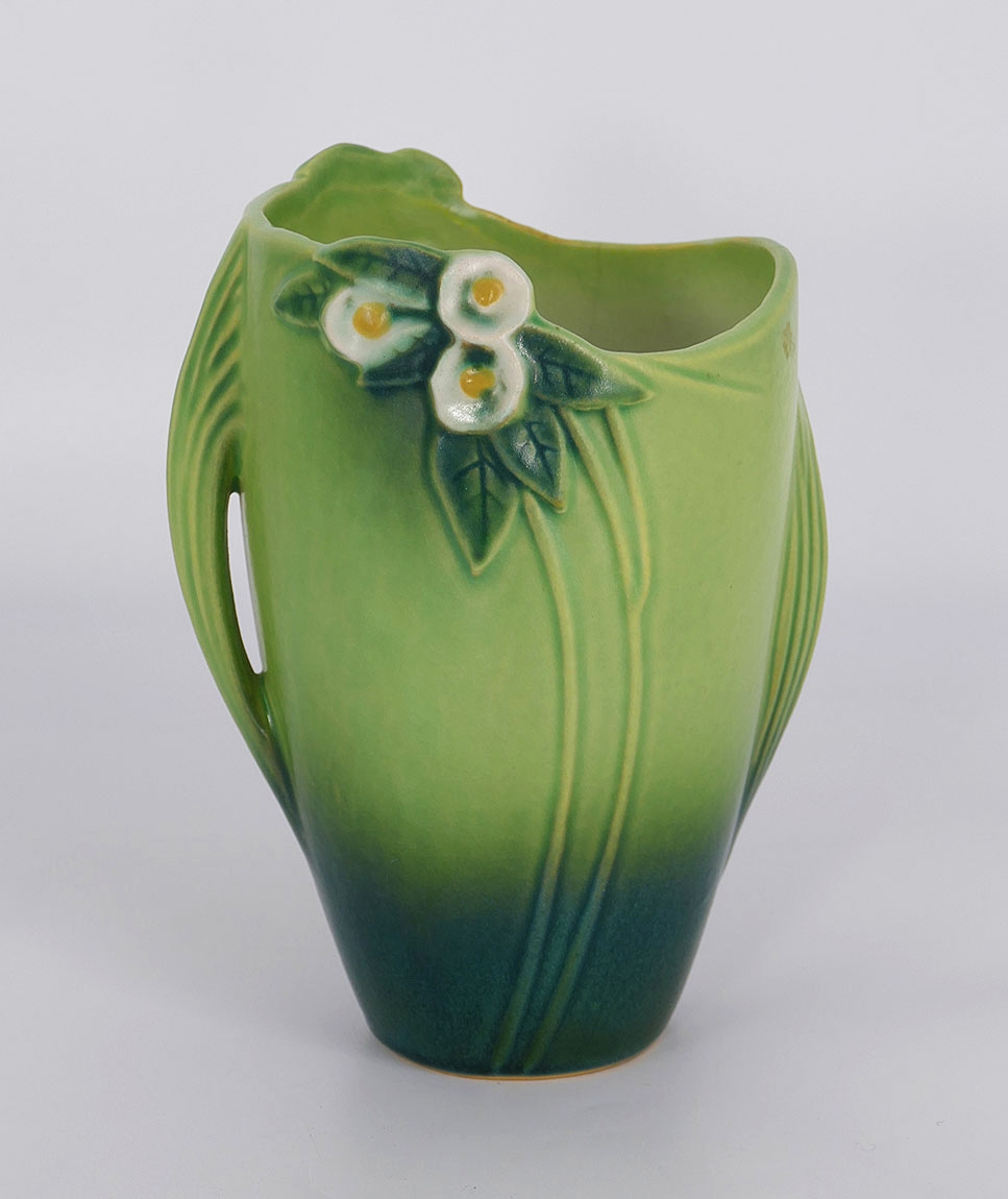Roseville Pottery Mock Orange Handled Vase - Model 983-7. Circa 1950. In Good Condition with a faint 2" long crack (please view photo).