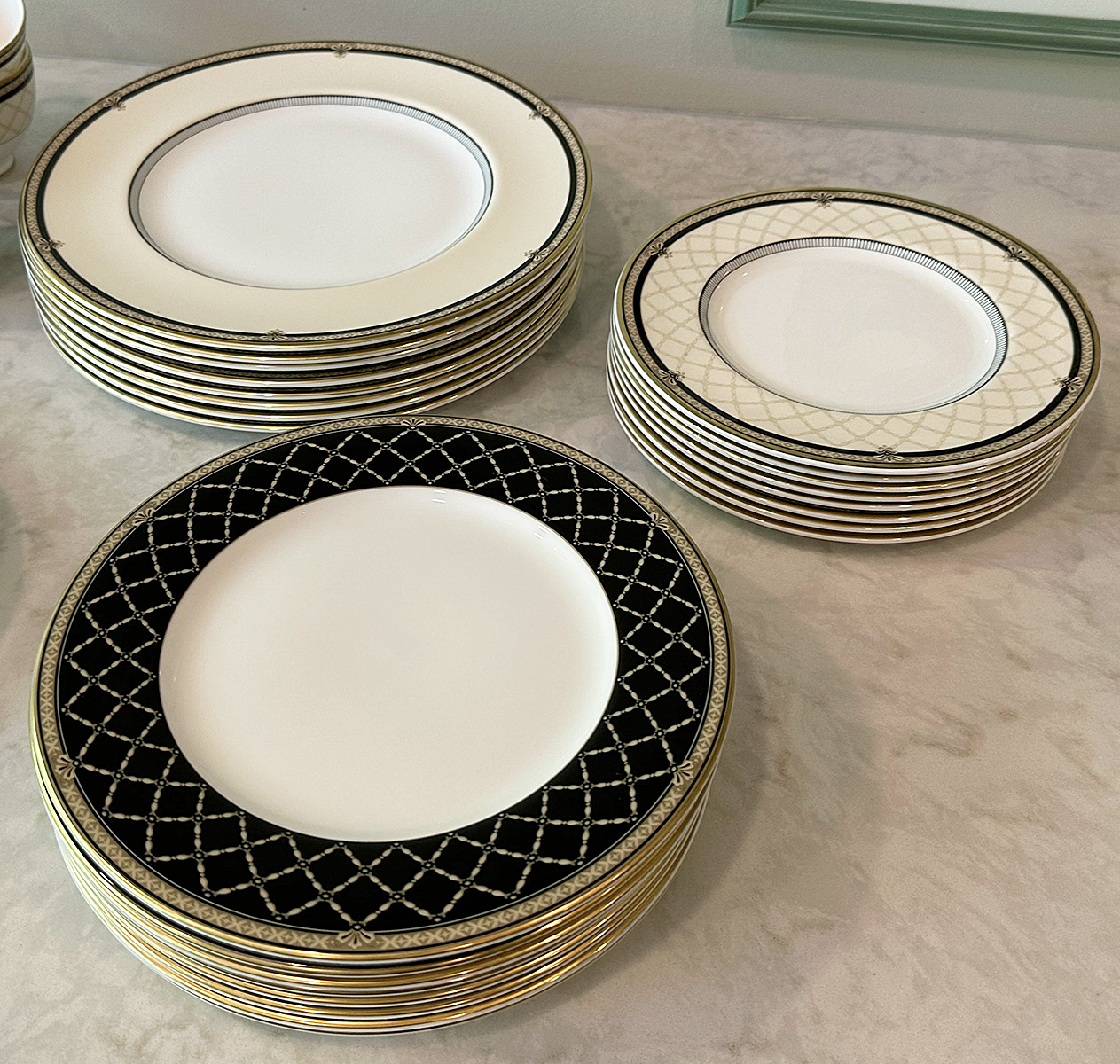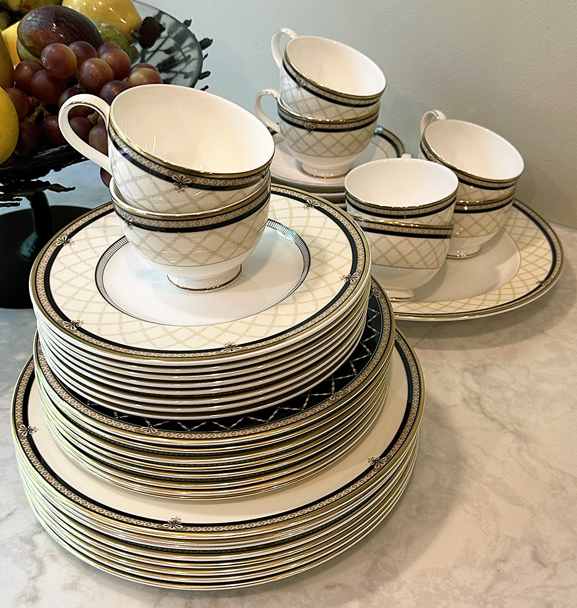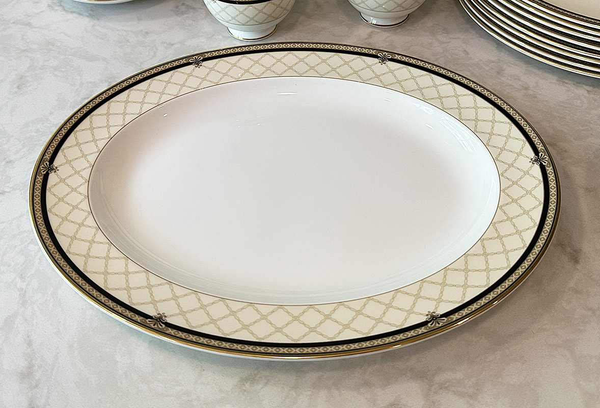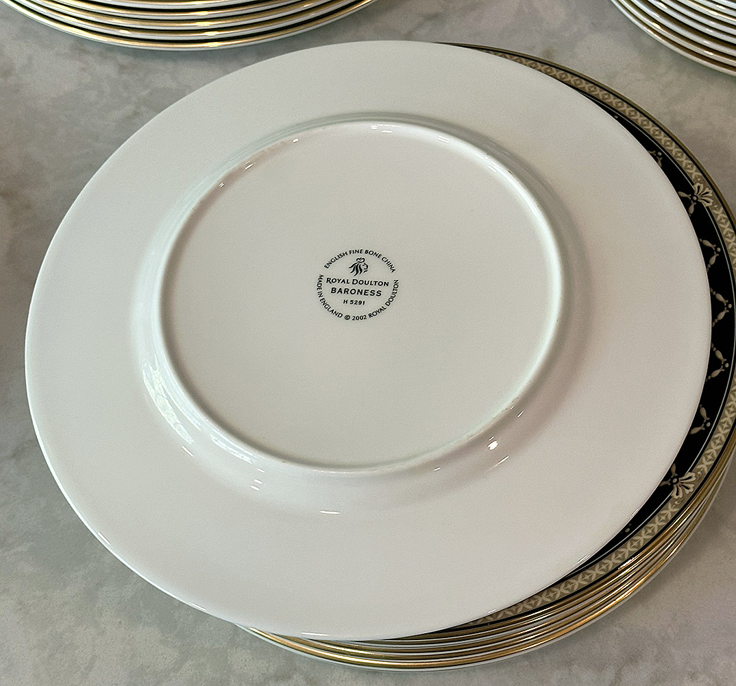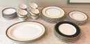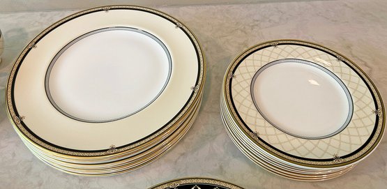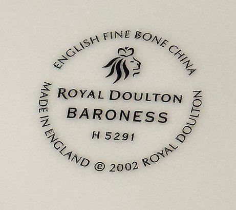Royal Doulton Baroness Bone China Set For 8. 41 Pieces Total. Includes 8 Footed Cups, 8 Saucers, 8 - 10 5/8" Dinner Plates, 8 - 8" Salad Plates, 8 - 9" Accent Luncheon Plates, and 1 - 13" Oval Serving Platter. In Very Good/Excellent Condition. Timeless pattern.