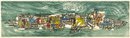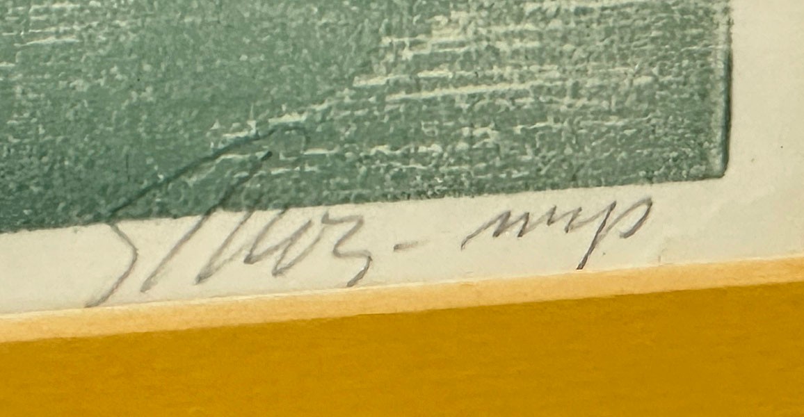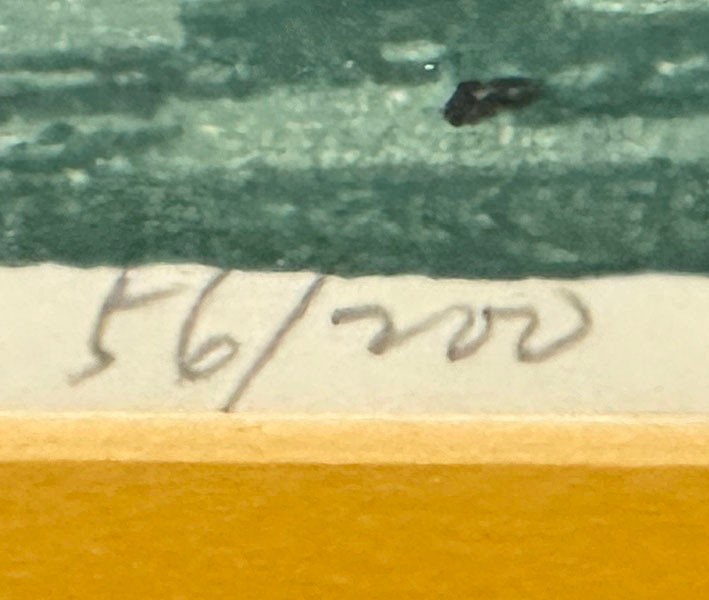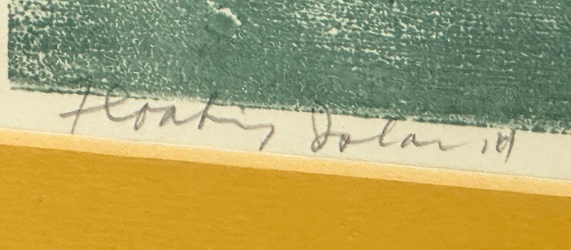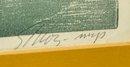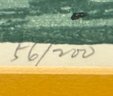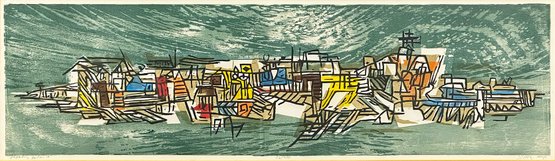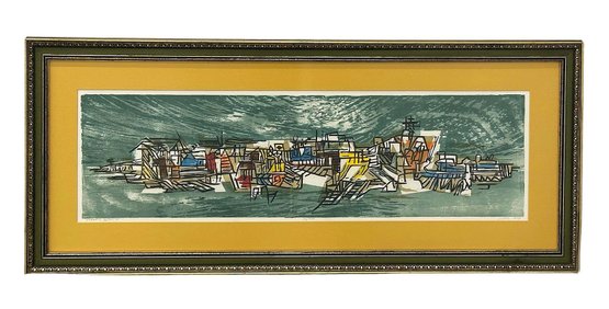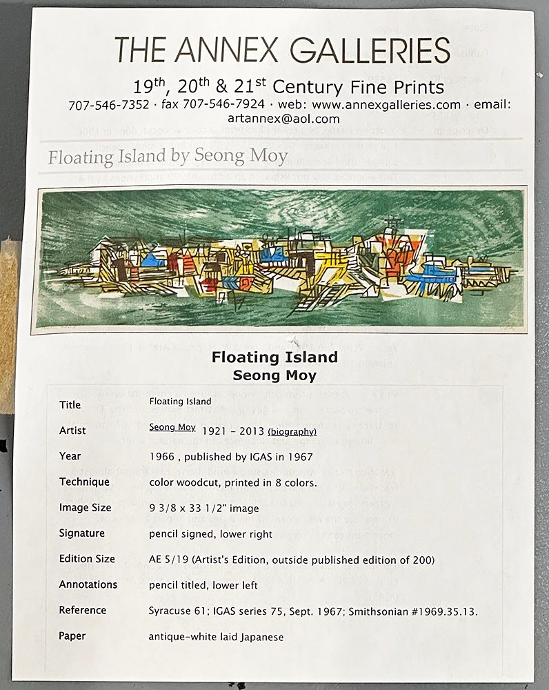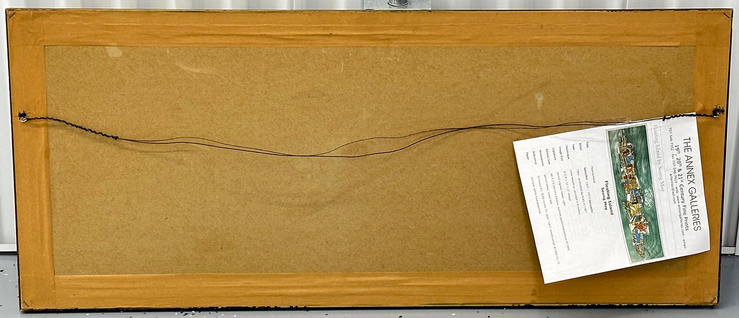 Seong Moy Color Woodcut Print "Floating Island". Framed. Signed, Titled, and Numbered in pencil by the artist. Edition Size: 200. Framed Measurements: 17.5" x 42.5". Small piece of wood damage on the frame.