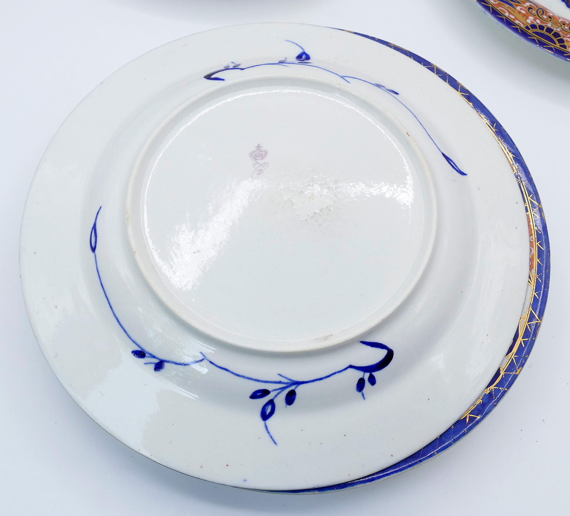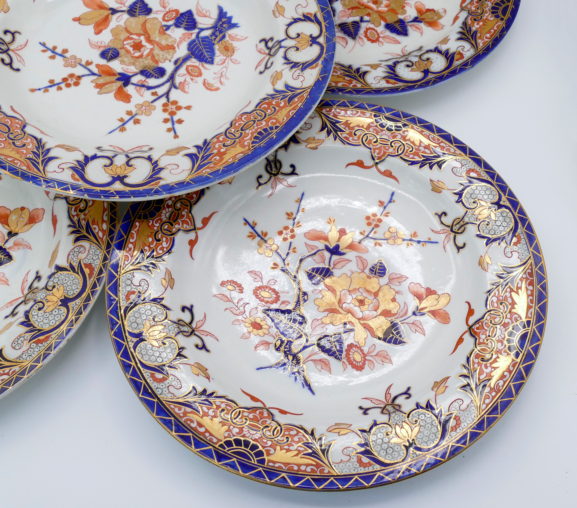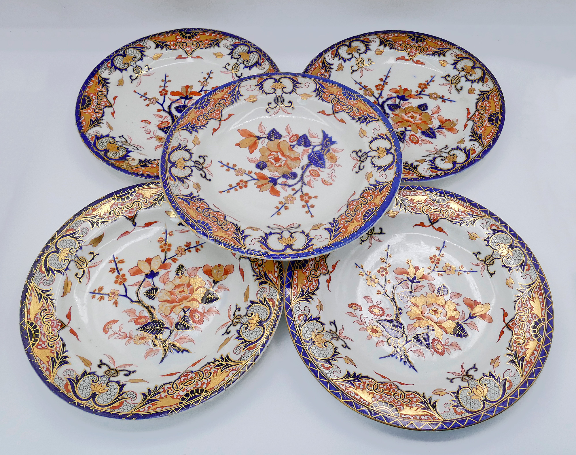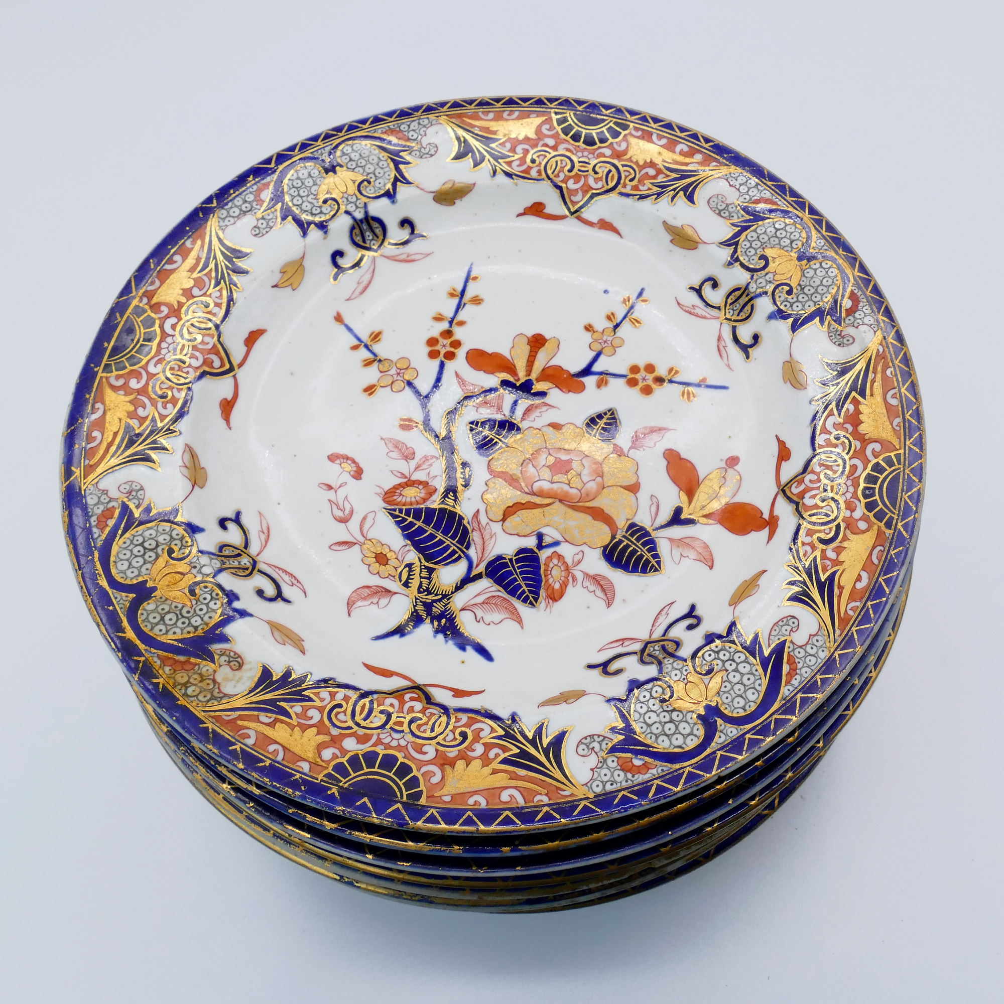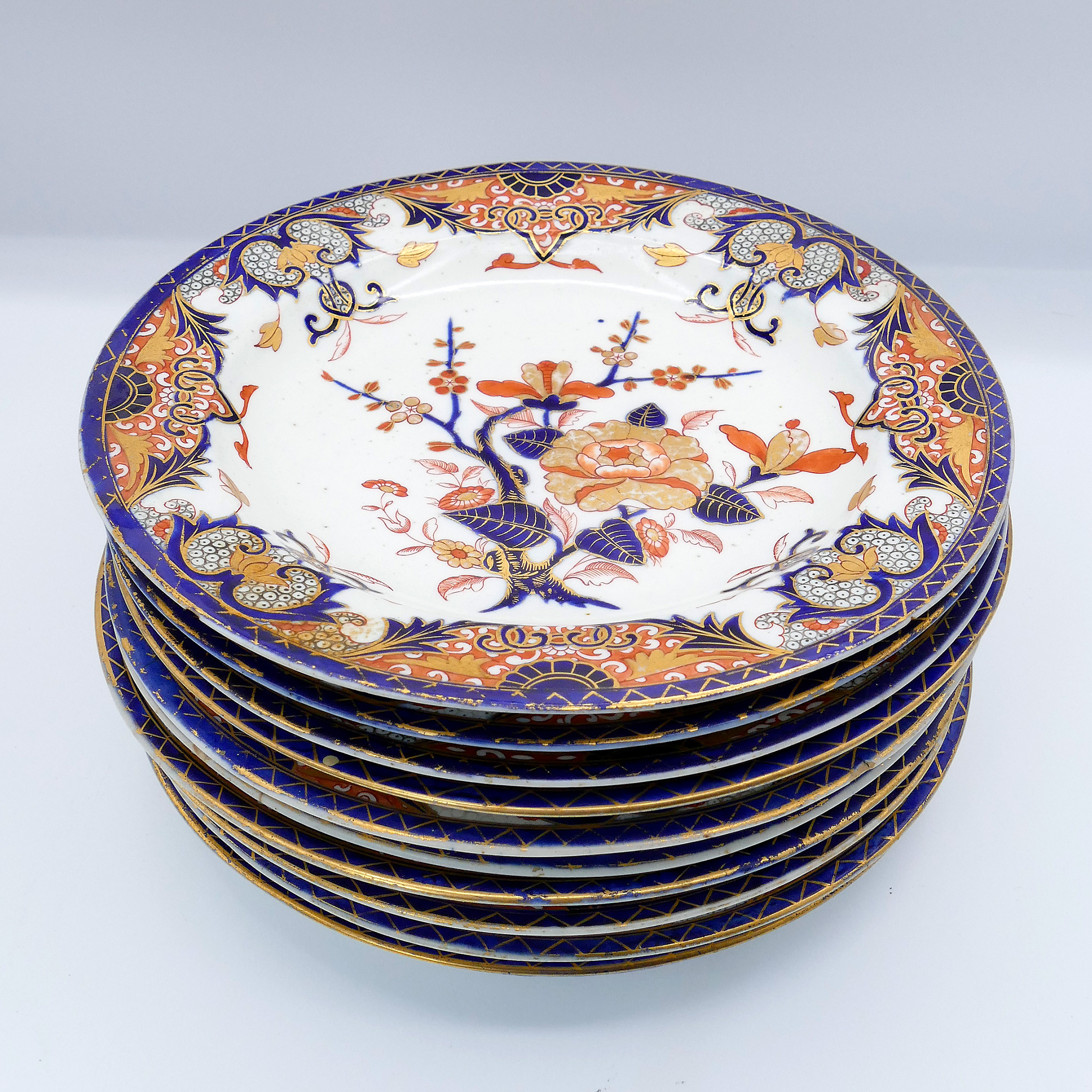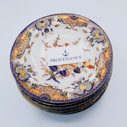 Set of 10 Royal Crown Derby Kings Imari Hand Painted Porcelain Dinner Plates. Circa 1806-1825. 9.5" Diameter. Blue glaze design underneath. In good overall condition.