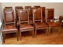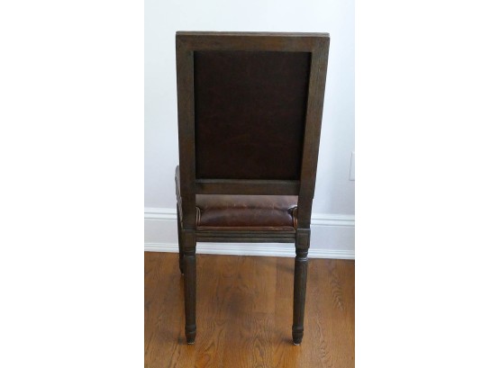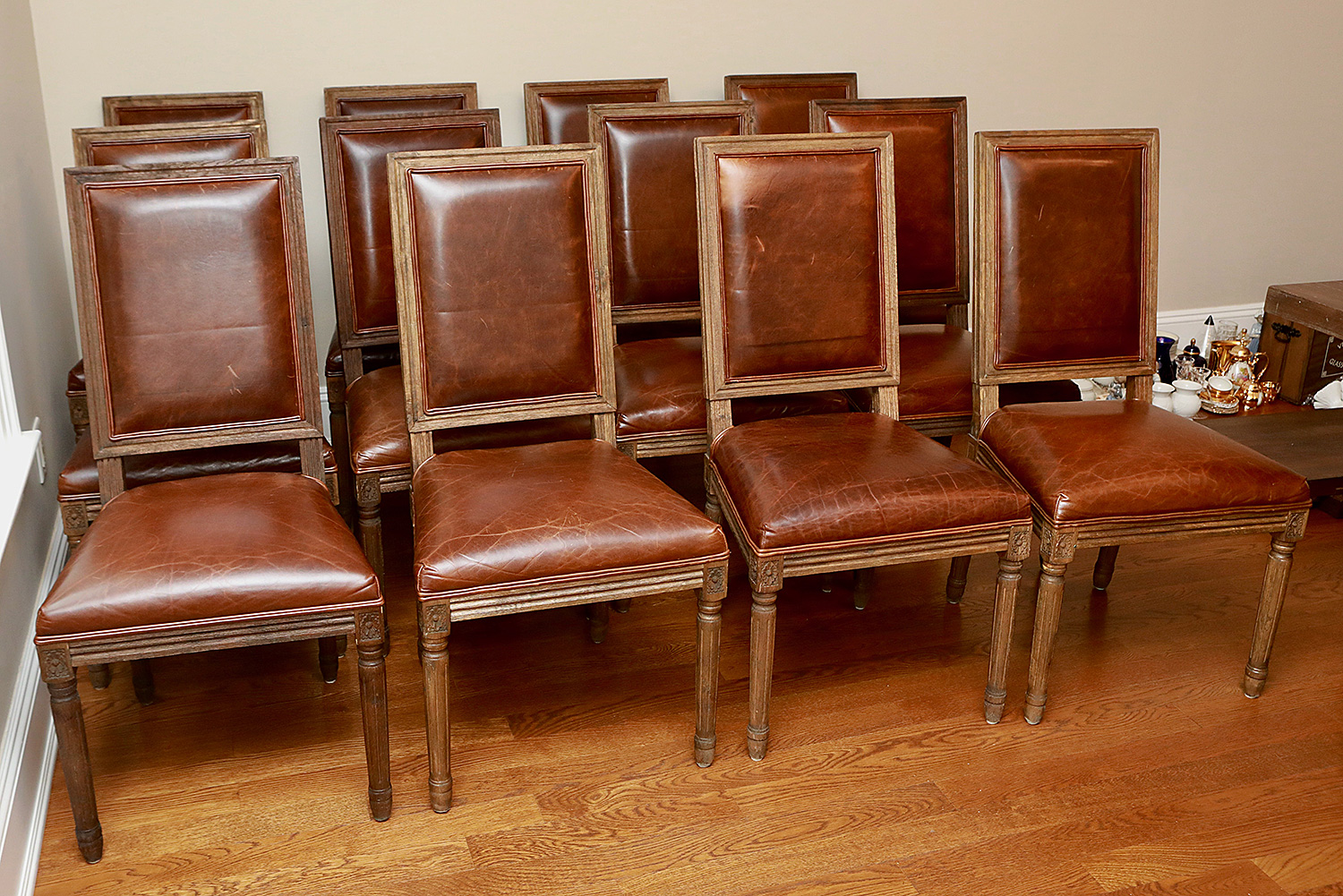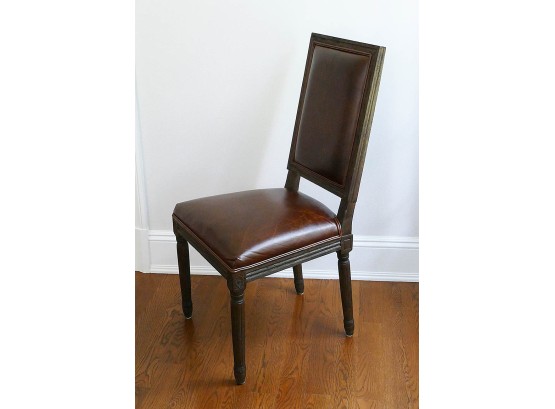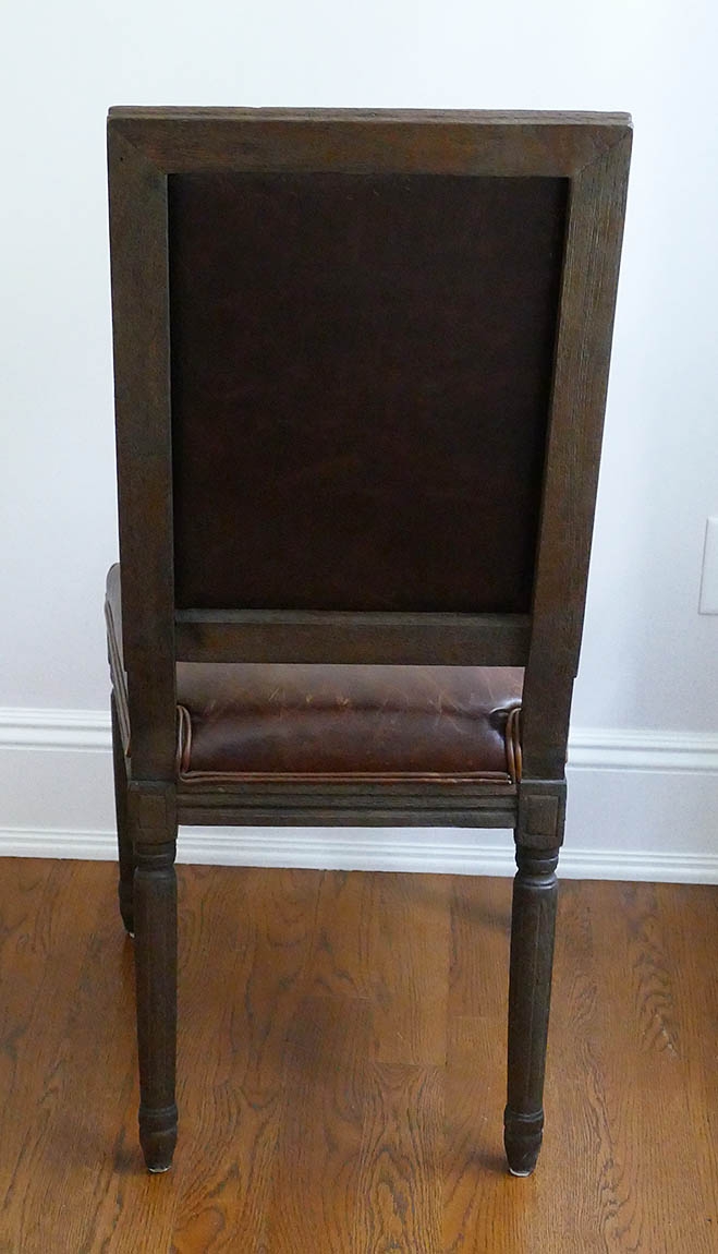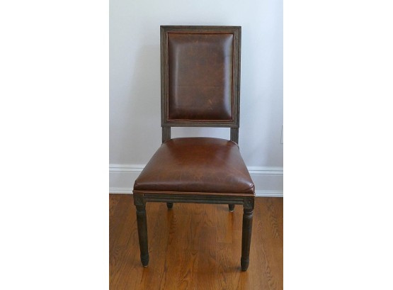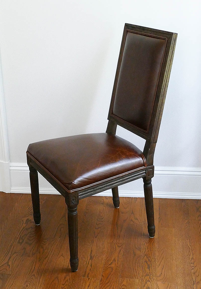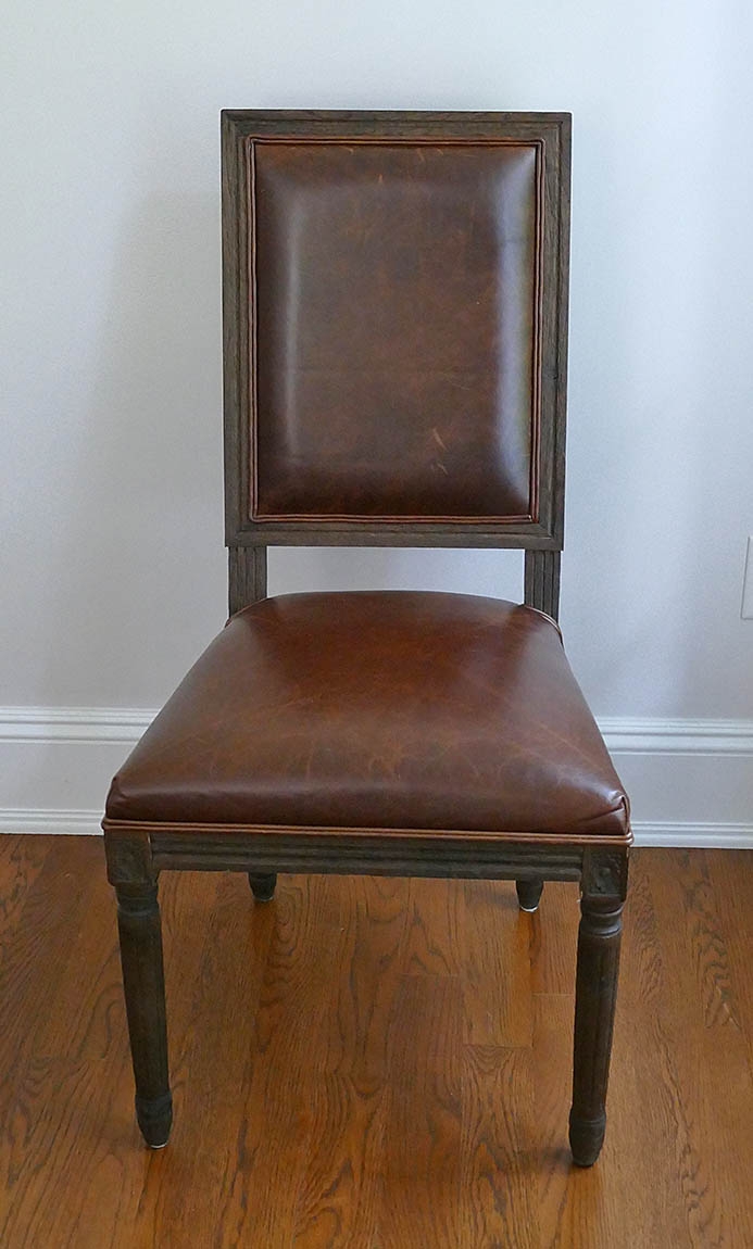 Set Of 12 Restoration Hardware Vintage French Square Back Leather Side Chairs. Defined by linear form and tapering fluted columnar legs, the chairs have been updated in hand-carved solid oak with a soft, weathered finish. These chairs are still available from Restoration Hardware at $825/Ea ($9900 for the set)
