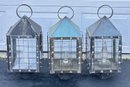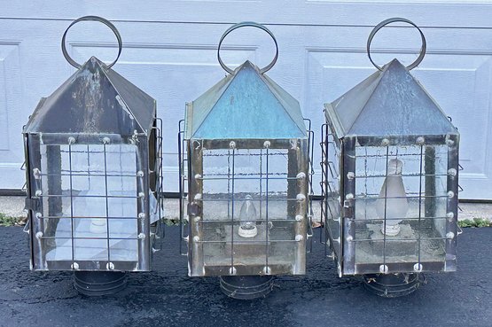 Set Of 3 Large Vintage Brass Electrified Post Top Lanterns. 27" Tall, 12" x 12". Some wear and tear, one has a broken glass panel. Will look great with some cleaning and light repair.