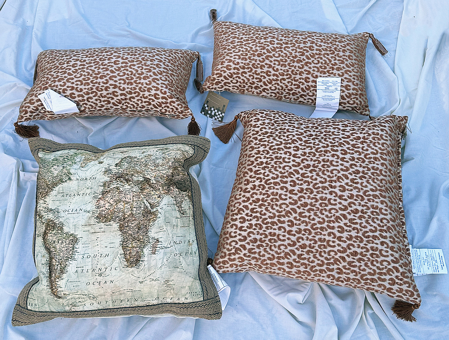 Set Of 4 Unused Throw Pillows. In Excellent Condition. For size reference, the pillow with the map measures 18" x 18".