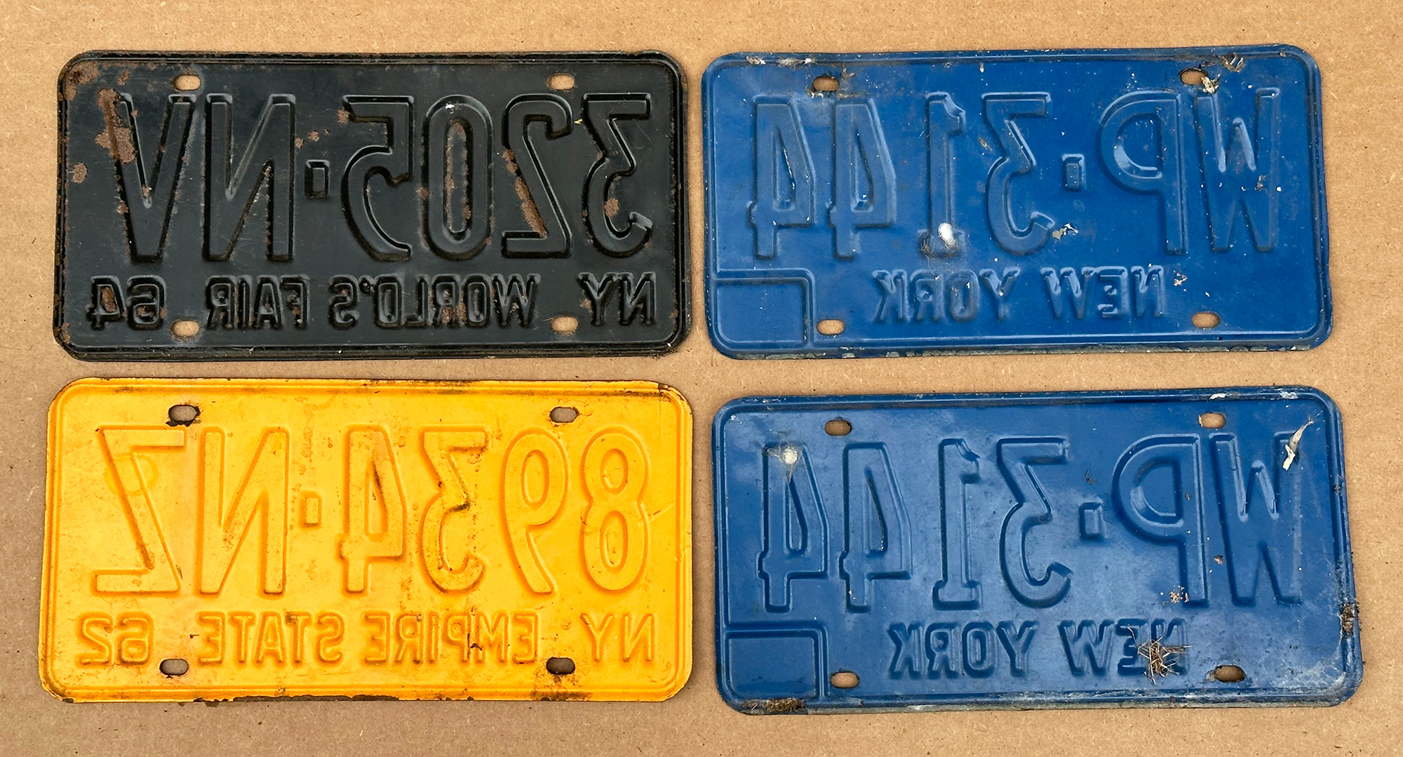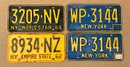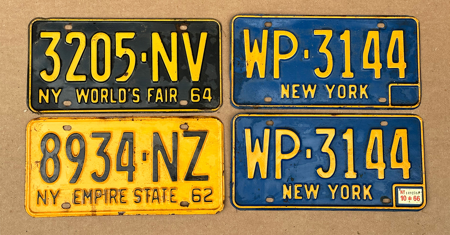 Set Of 4 Vintage 1960's New York License Plates. Includes a World's Fair plate, and a complete pair. In goood condition.