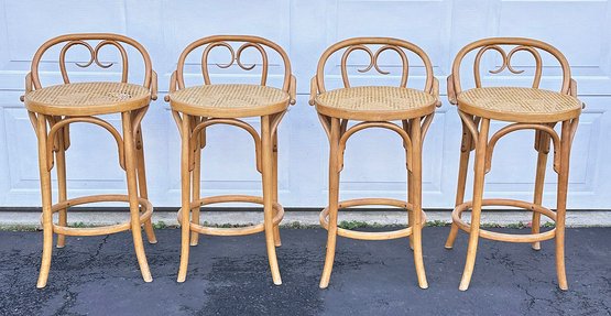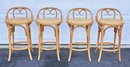 Set Of 4 Vintage 1970's Bentwood Counter Stools With Cane Seats. 25" Seat Height. One seat needs cane repair, the other 3 are in good condition with some wear. 18" x 18" x 31"h (25" seat height).