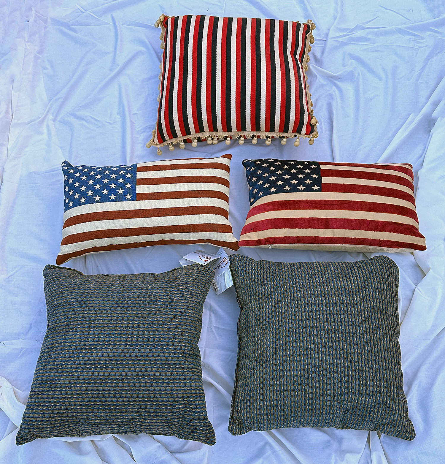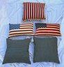 Set Of 5 Throw Pillows. Including 2 with the American Flag and one with Stripes. These have never been used and some still have the tags attached. In Excellent Condition. For size reference, the flag pillow measures 11" x 17"