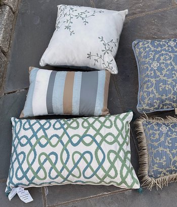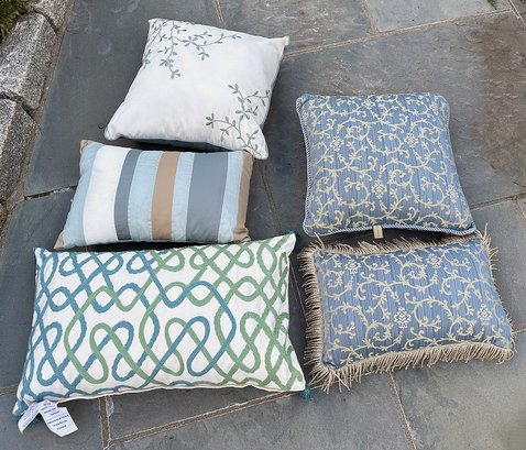 Set Of 5 Throw Pillows. Most were never used and in Excellent Condition. For size reference, the tan pilloe measures approximately 17"x 17".