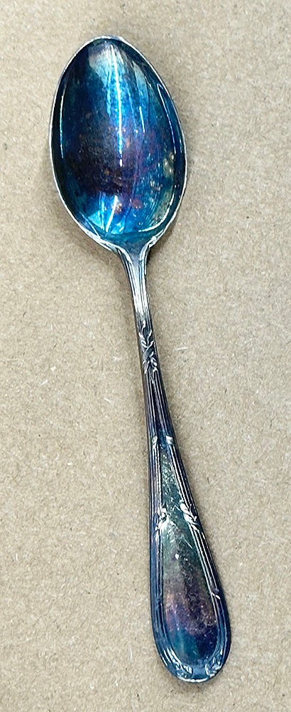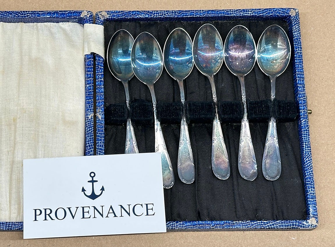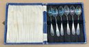 Set Of 6 Coin Silver Demitasse Spoons In Case. 90% Pure Silver. 4.25" Long. In good condition. Weight: 72.87 Grams, 2.57 Ounces, 2.34 Troy Ounces.