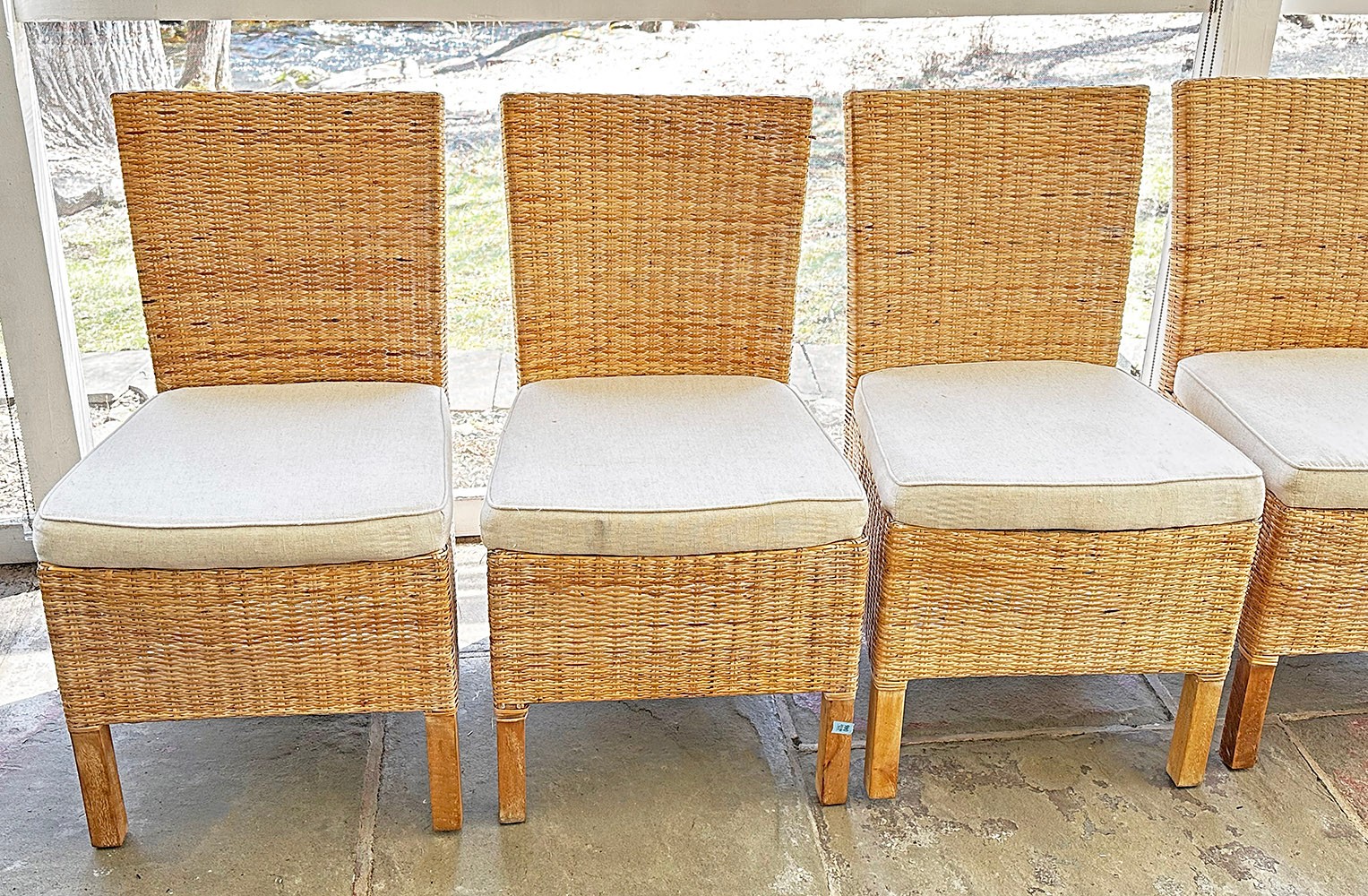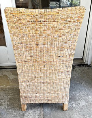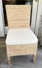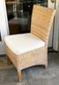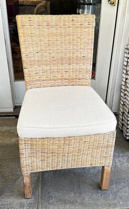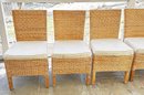 Set Of 6 Woven Wicker Dining Chairs. With beige upholstered cushions. 20" x 19" x 35"h