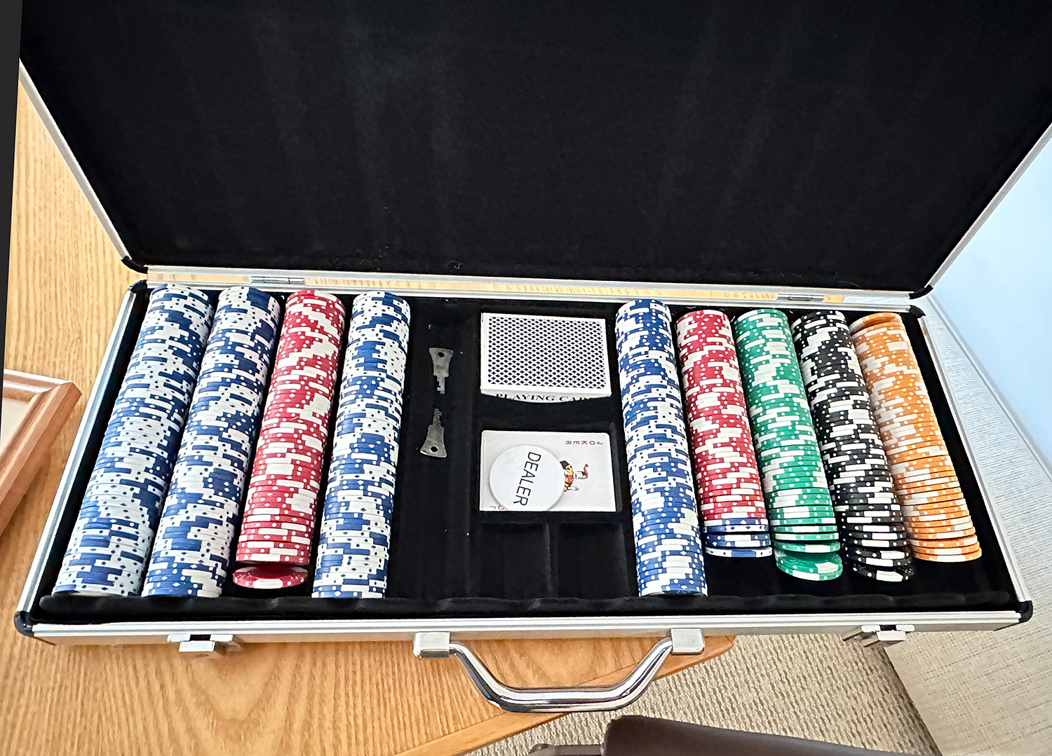 Set Of Poker Chips & Playing Cards In An Aluminum Lockable Case. In good condition. Includes the keys.