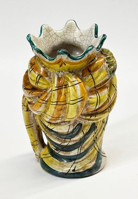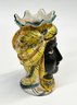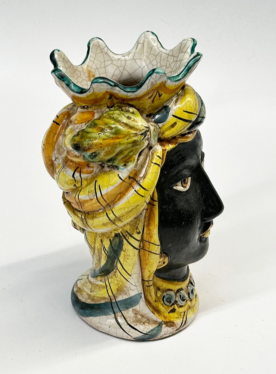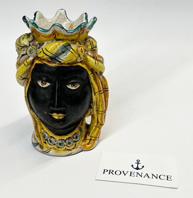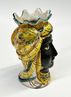 Sicilian Moorish Head Earthernware Vase From Caltagirone. In Good Condition. Signed on the base. 8" Tall.